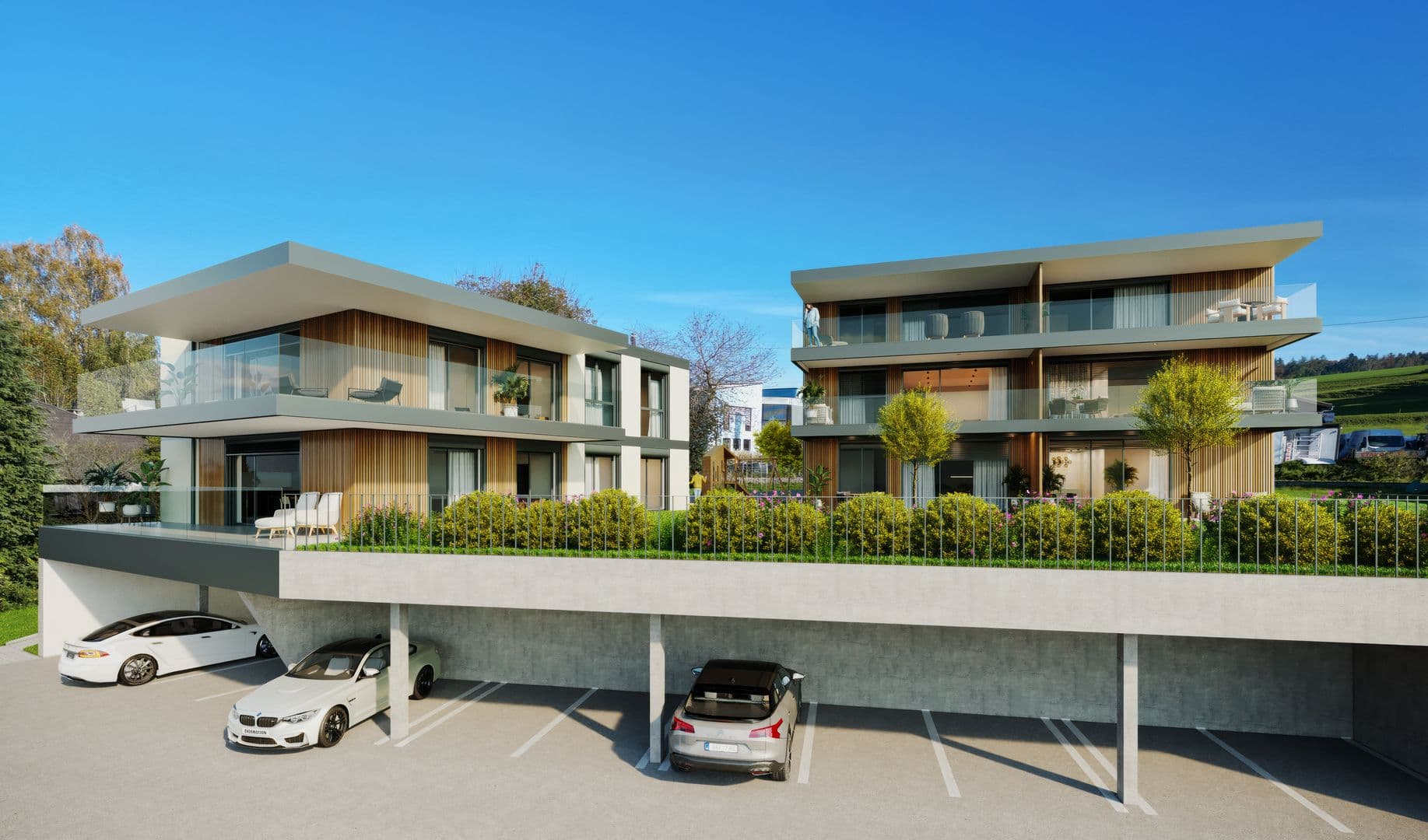 Des places de parking couvertes sont disponibles en supplément au prix de CHF 30'000.– par unité, en sus du prix de vente des appartements.