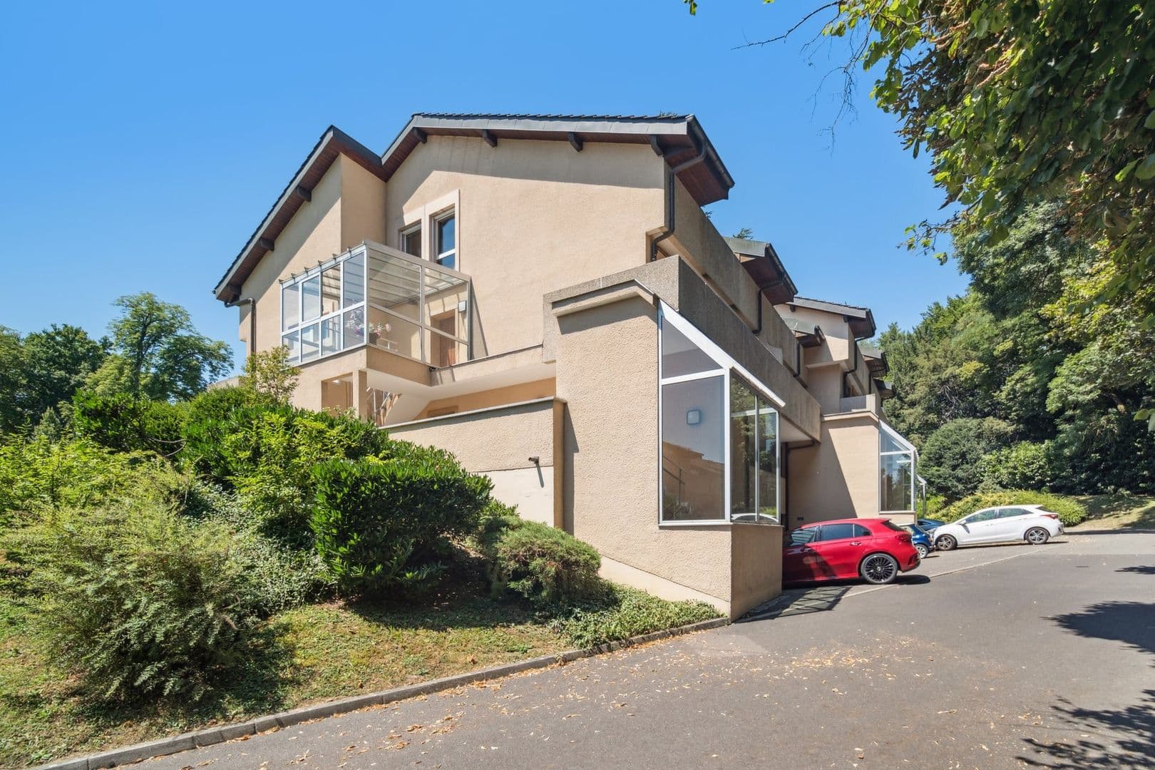 Situé dans un cadre verdoyant et prisé, au sein d’une résidence sécurisée, ce bel attique en duplex occupe le premier et dernier étage d’un immeuble, niché au cœur du paisible quartier de Chêne-Bougeries, à deux pas de Genève. L’emplacement offre un cadre de vie privilégié, avec un accès rapide aux transports en commun, aux écoles, aux commerces et aux espaces verts.