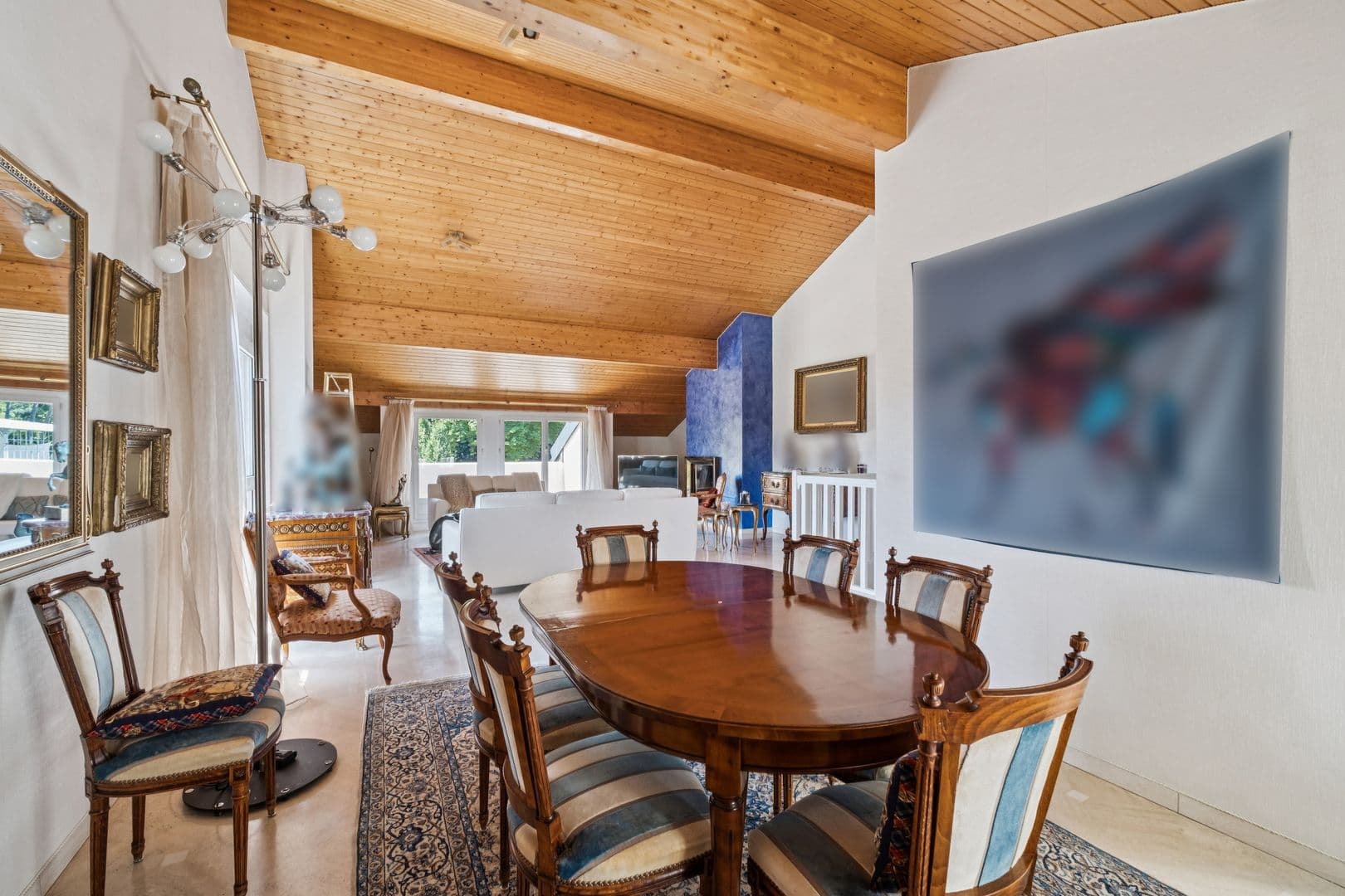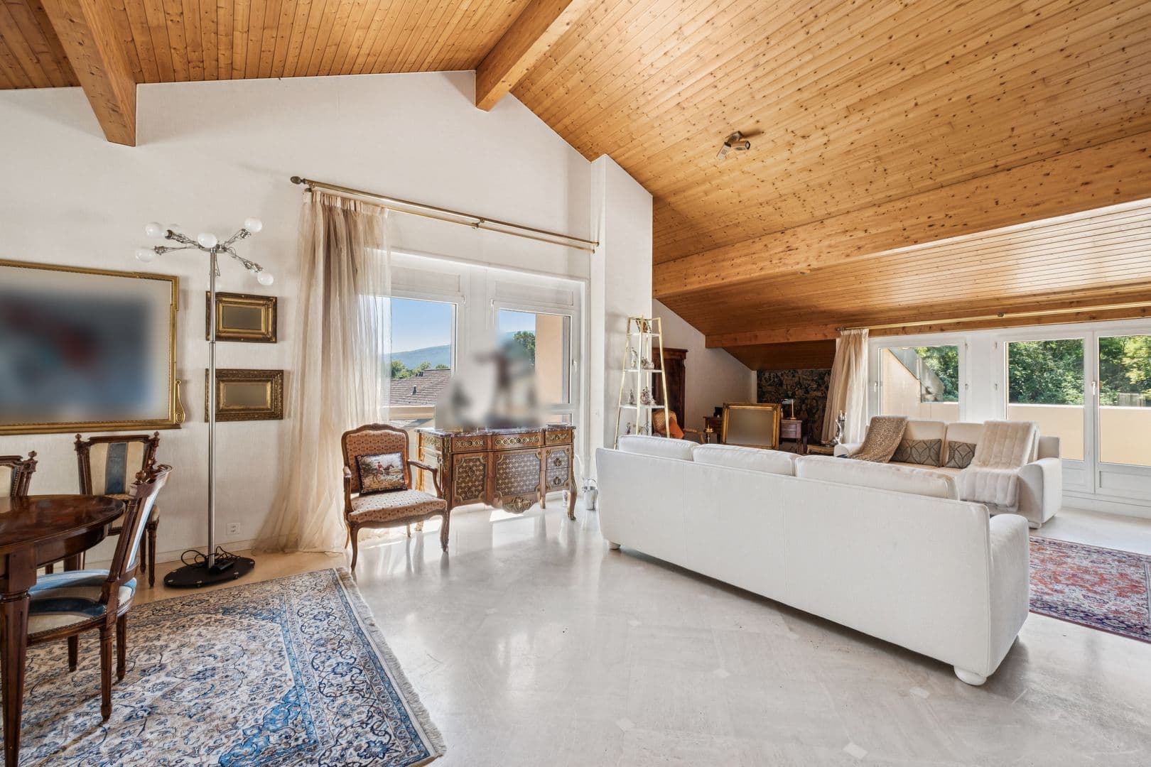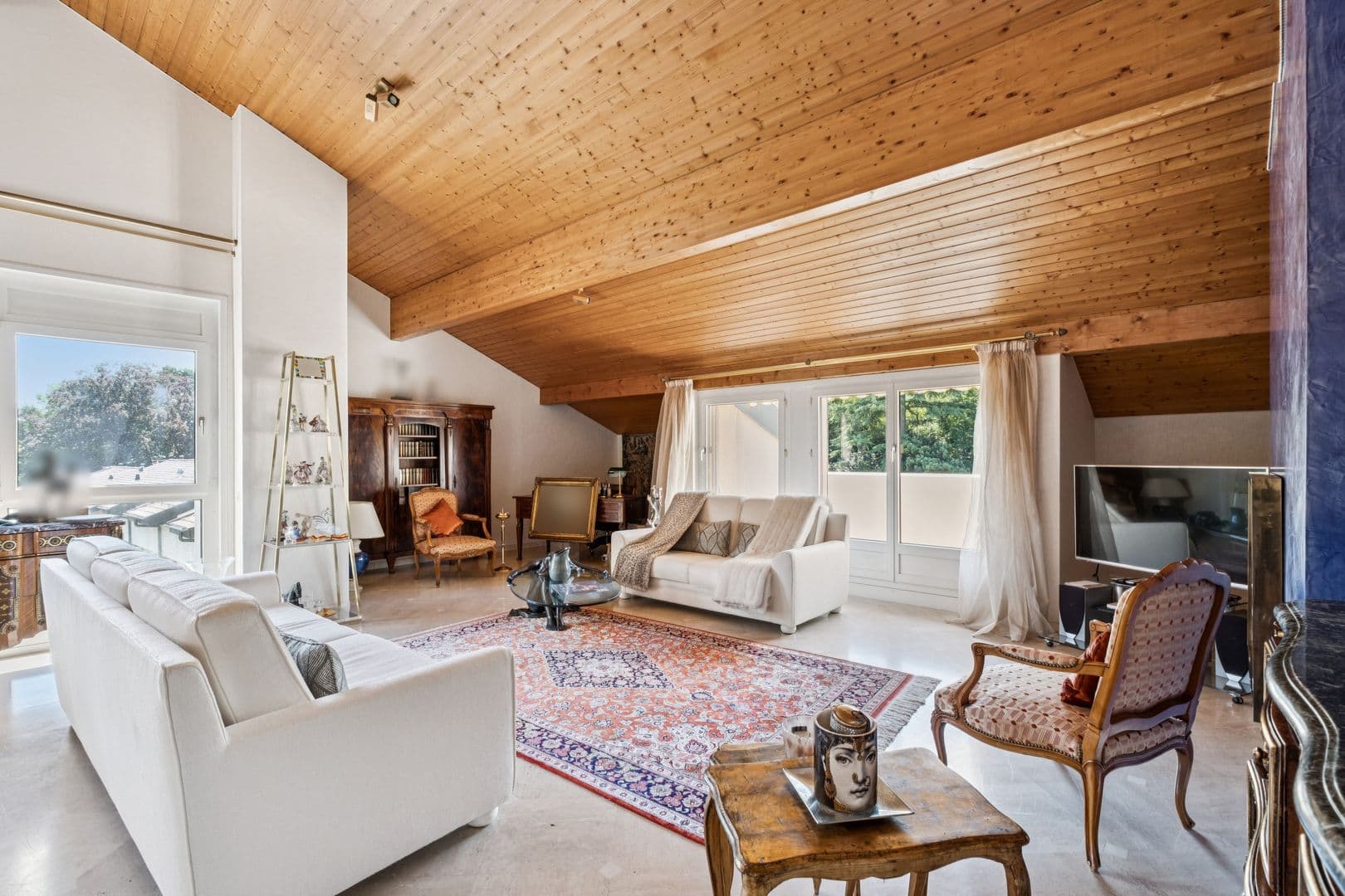 À l’étage supérieur, en attique, d’une surface PPE de 99 m², une vaste pièce de vie traversante, baignée de lumière, abrite un salon avec cheminée et une salle à manger prolongés par deux terrasses. La cuisine indépendante s’ouvre également sur un espace extérieur. Grâce à sa double orientation, l’appartement profite d’une luminosité optimale.