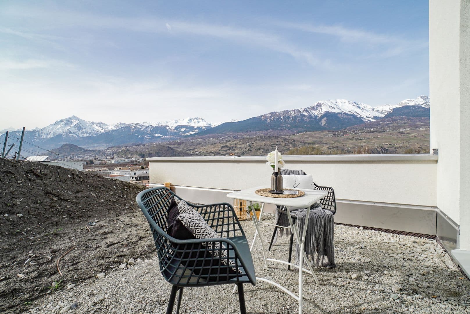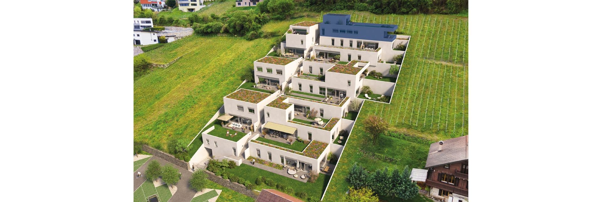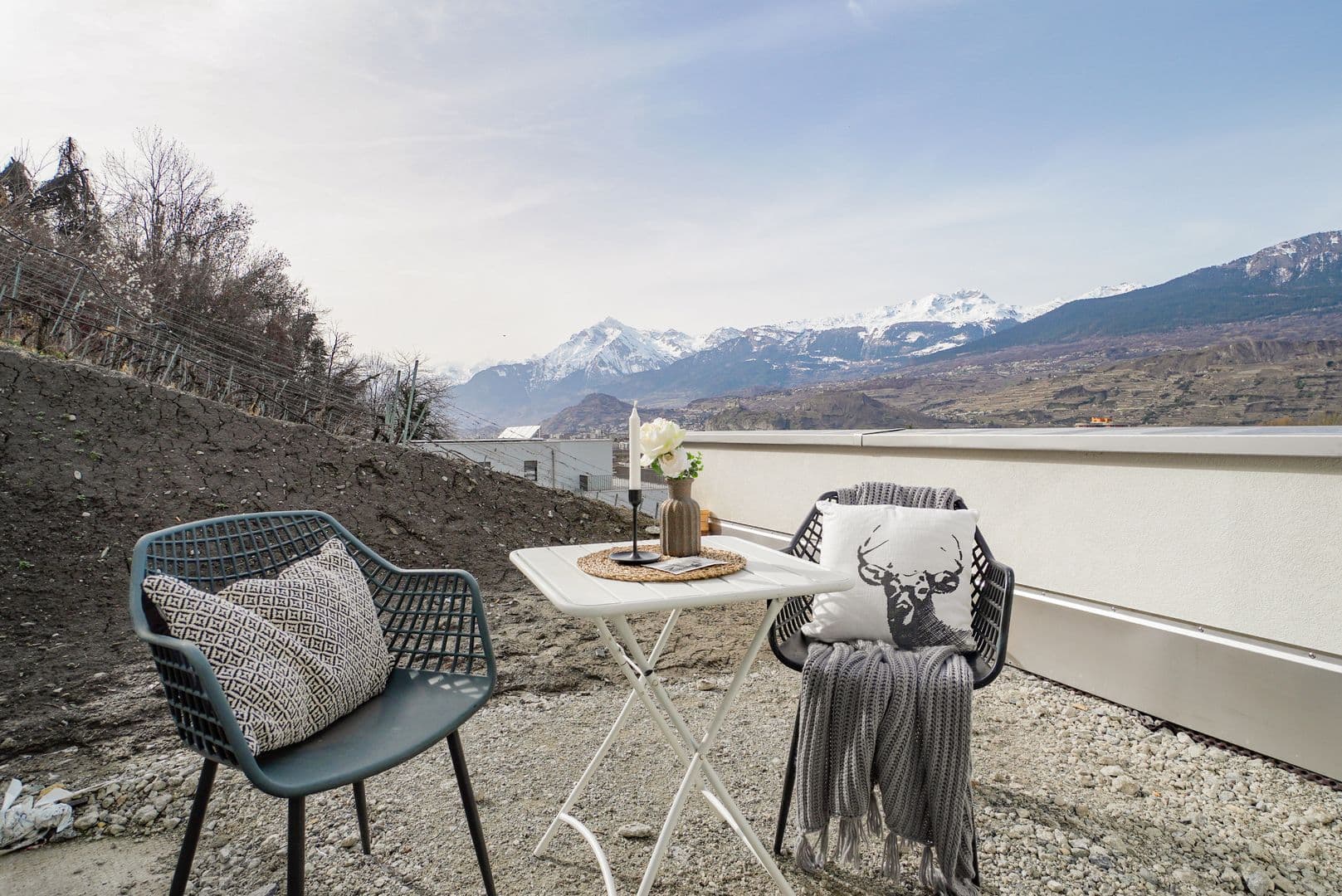 L'aspect extérieur ne fait pas exception à cette philosophie verte, avec des terrasses et jardins privatifs aménagés où il fait bon se détendre et profiter de la nature environnante. Sans vis-à-vis et face aux Alpes, ces derniers offrent une splendide vue sur la ville de Sion, la basilique de Valère et le château de Tourbillon.