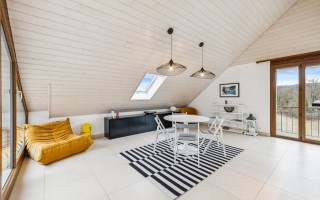 Dès l’entrée, on est frappé par l’ouverture du séjour. La pièce de vie, baignée de lumière naturelle grâce à de grandes baies vitrées, bénéficie d’une hauteur sous plafond pouvant atteindre 6,80 mètres, accentuant encore la générosité des volumes. Une cheminée fonctionnelle apporte une touche de convivialité. Le séjour donne accès à une terrasse de 10 m², idéale pour profiter du soleil et du calme environnant. Au sol, un très beau carrelage céramique pour les pièces de jour et du parquet massif pour les chambres.