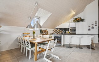 La cuisine, ouverte sur l’espace de vie, est entièrement équipée, elle dispose notamment d’une plaque à induction et d’un lave-vaisselle neuf. Elle s’intègre parfaitement à l’ensemble de la pièce, créant un lieu de vie convivial et central car elle est semi-ouverte sur la salle à manger.