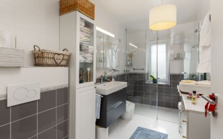 La partie nuit offre deux chambres de belles dimensions, propices au calme et au repos, complétées par une salle d’eau contemporaine équipée d’une douche à l’italienne. Une pièce supplémentaire, actuellement aménagée en WC visiteurs et buanderie, dispose des raccordements nécessaires pour l’installation d’une douche additionnelle, permettant d’envisager aisément la création d’une seconde salle d’eau selon les besoins.