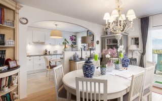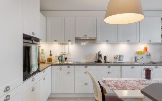 À l’intérieur, l’appartement développe une surface habitable d’environ 85 m², avec une distribution fluide et optimisée. L’espace de vie principal, orienté sud-est, bénéficie d’une belle luminosité tout au long de la journée et s’ouvre sur un panorama dégagé mêlant campagne, lac et Alpes en arrière-plan. La cuisine ouverte, au design moderne et épuré, s’intègre avec élégance à la salle à manger et au séjour, formant un espace chaleureux, idéal pour les moments de partage.