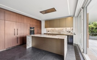 L'intérieur du penthouse est une fusion artistique de l'élégance moderne et du design intemporel, avec des plafonds s'élevant à plus de 3 mètres. Le spacieux salon, orné de fenêtres allant du sol au plafond, baigne l'espace de lumière naturelle et encadre la ligne d'horizon de la ville comme une œuvre d'art. La pièce maîtresse du salon est une impressionnante cheminée en marbre qui s'étend sur toute la hauteur de la pièce.