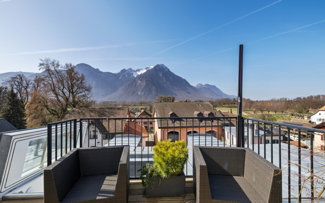 Point d’orgue de la propriété, un superbe toit-terrasse invite à la détente et offre une vue dégagée sur la réserve naturelle des Les Grangettes Nature Reserve ainsi que sur les majestueuses Alpes valaisannes, un cadre privilégié pour profiter de moments uniques en toute sérénité.