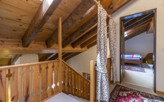 En franchissant la porte, vous découvrez dans une petite entrée avec placards intégrés à gauche, et un couloir menant à la cuisine semi-ouverte en passant devant un petit WC invités à droite. Juste en face on voit le chaleureux séjour avec accès au balcon et ses hauts plafonds, séparé du coin repas par une impressionnante cheminée presque indépendante au centre, à l’opposé du plan de travail de la cuisine. À côté de la salle à manger, il existe non seulement la porte du studio individuel avec sa salle de douche et son entrée privatives, mais aussi l'escalier menant au deuxième étage, où se trouvent deux chambres confortables qui se partagent une salle de bains séparée au milieu.