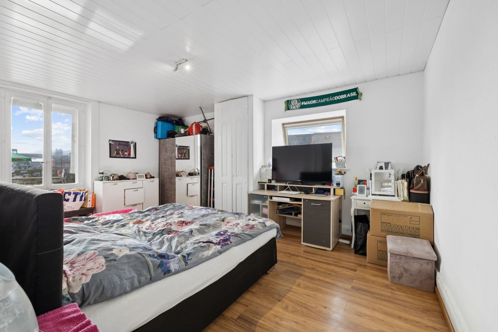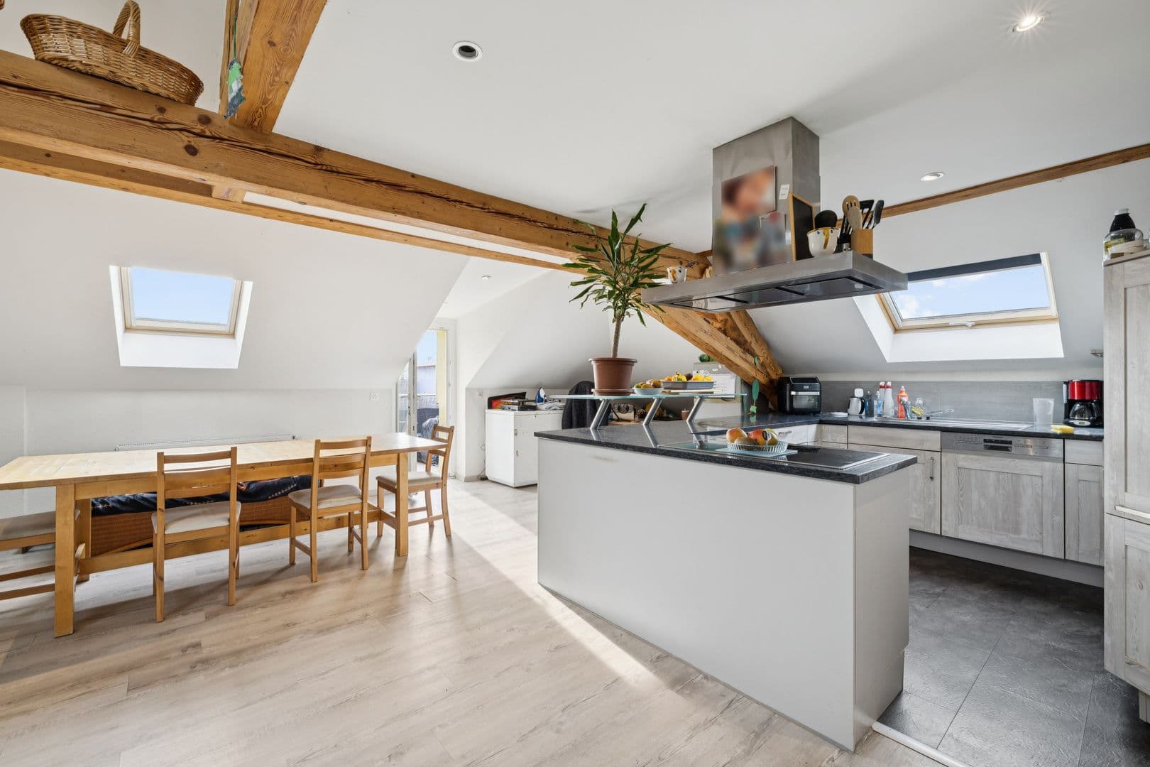 Au 2ème étage, un appartement de 4.5 pièces en combles, fortement mansardé, développe environ 158 m² de surface de plancher (combles et mezzanine incluses). Un balcon d’environ 10 m² vient compléter ce niveau. En raison de la configuration mansardée, la surface habitable nette n’a pas été déterminée précisément.