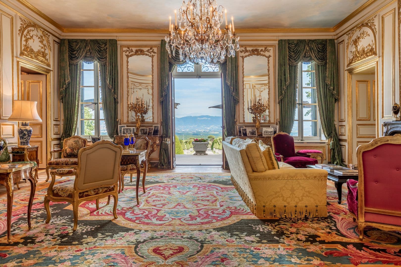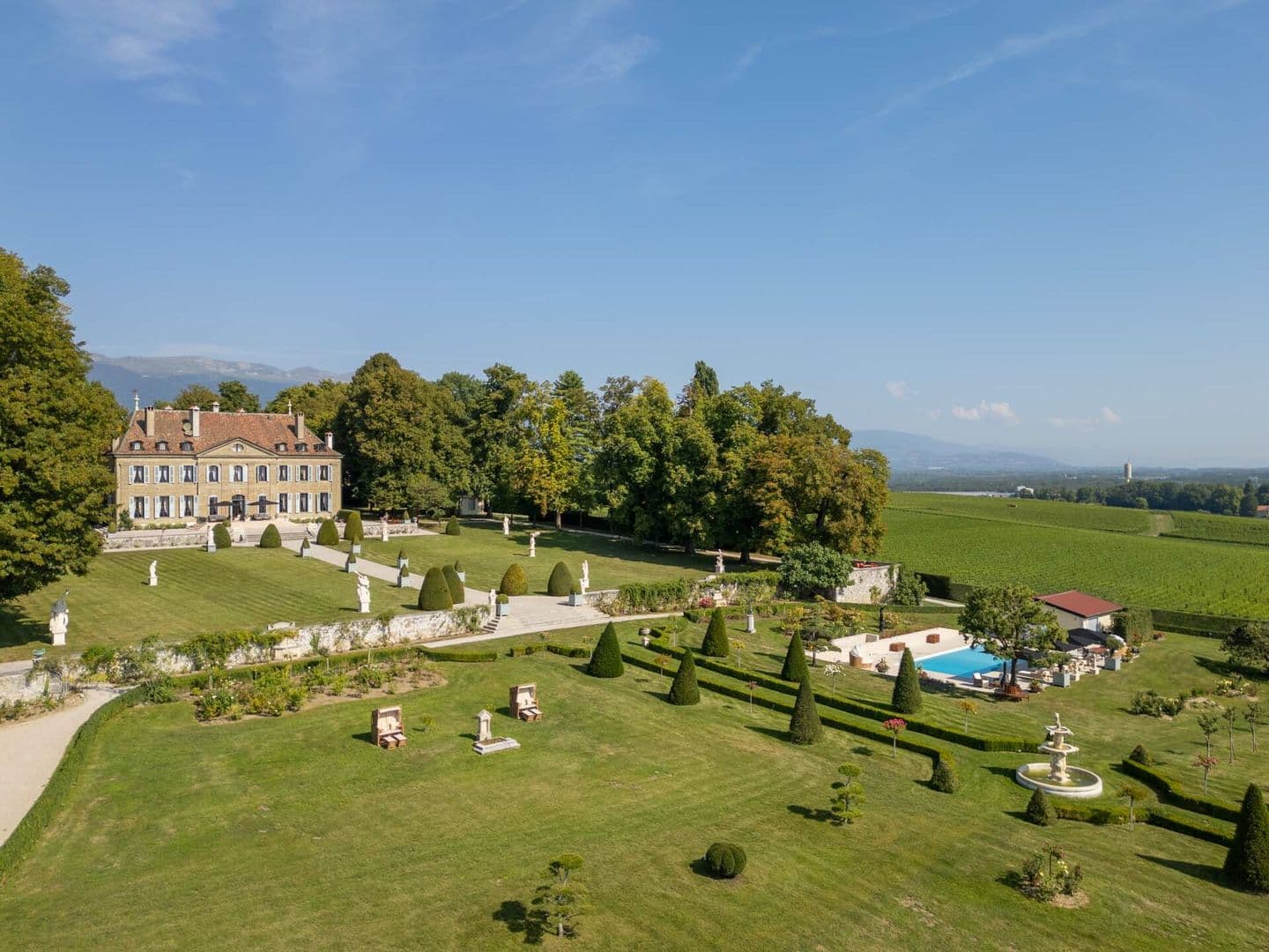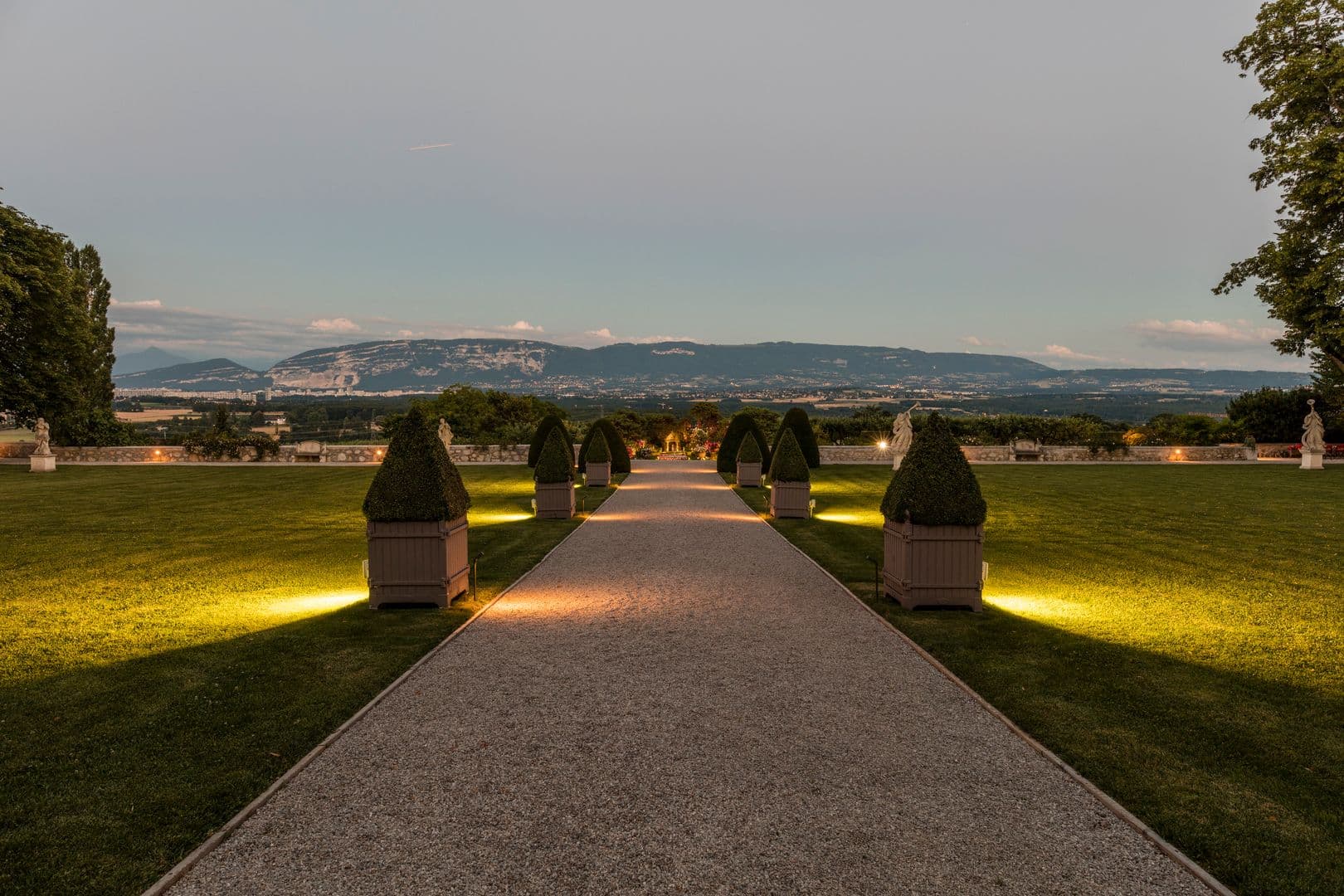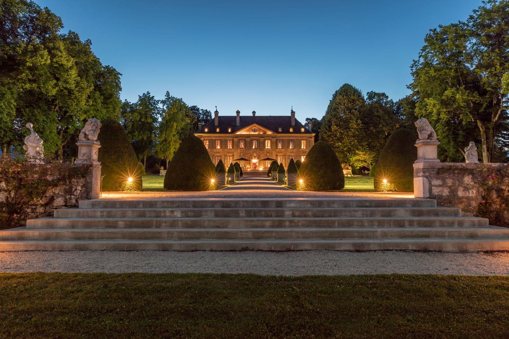 Le château dispose aussi des plusieurs jardins remarquablement paysagés et décorés, grâce à ses nombreuses statues et arbres éclairés, sa fontaine centrale, sa roseraie et ses chemins d'accès pour se balader autour de la bâtisse en toute quiétude tout en admirant une vue sublime et dégagée sur le Salève et la ville de Genève. De jour comme de nuit, une ambiance de luxe et de raffinement vous envahiront dans ce cadre idyllique.