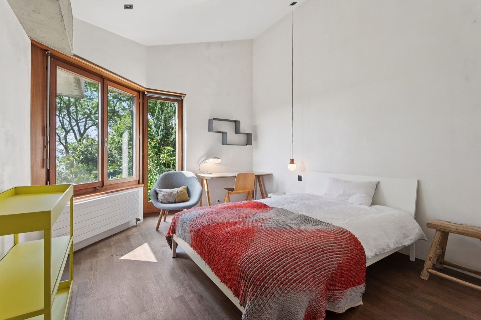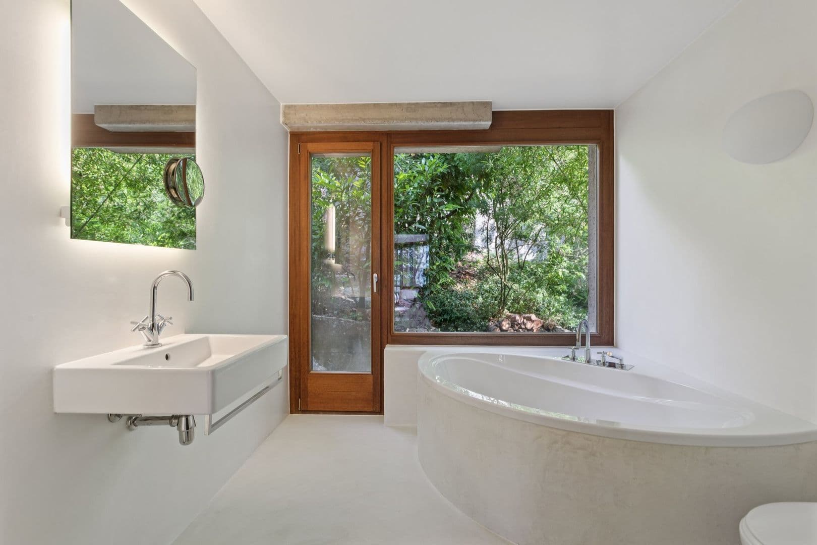 L’intérieur, rénové par touches délicates, marie béton ciré, bois massif et volumes chaleureux, sans chercher la perfection figée. Chaque pièce invite à ralentir, à écouter le vent dans les arbres, à laisser le temps s’étirer.
