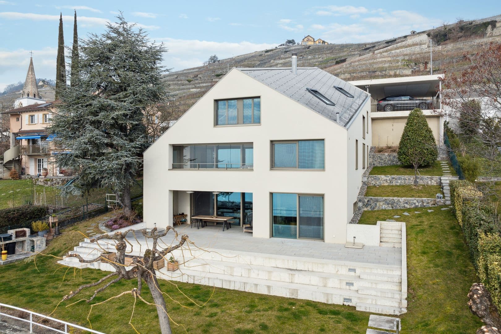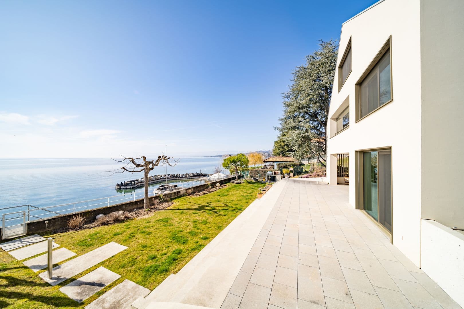 Située à Villette, cette splendide maison contemporaine, construite en 2020, offre 486 m² utile (410 m² habitables), répartis sur trois niveaux, avec ascenseur et un aménagement optimal pour un confort de vie inégalé. Véritable bijou, elle bénéficie d'une situation exceptionnelle au bord du lac, avec une plage privée, sans servitude de passage devant la propriété, et un permis de construire en force pour l’ajout d’un garage à bateau. De plus, elle dispose de six places de stationnement extérieures, dont trois couvertes, pour le plus grand confort de ses habitants.
