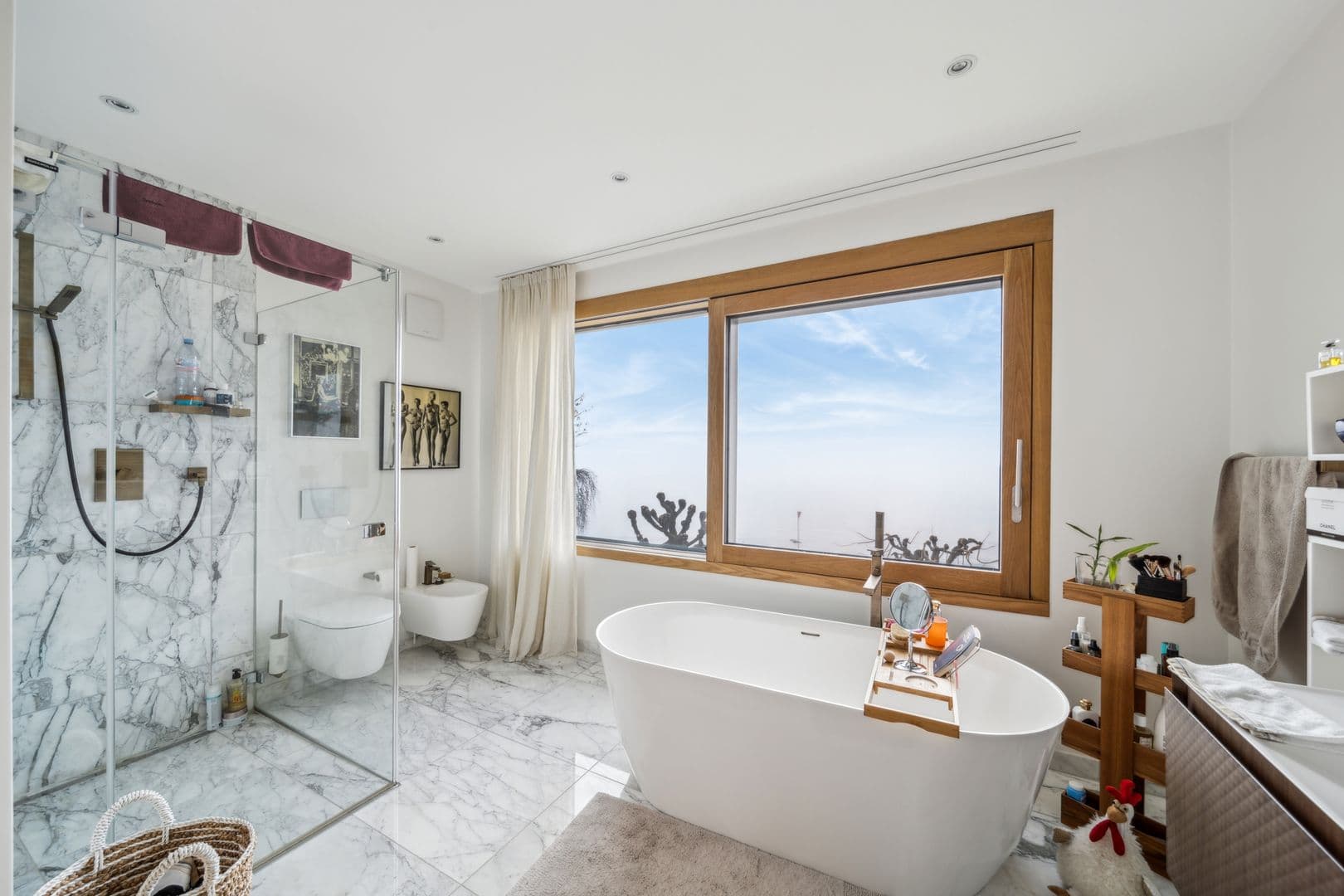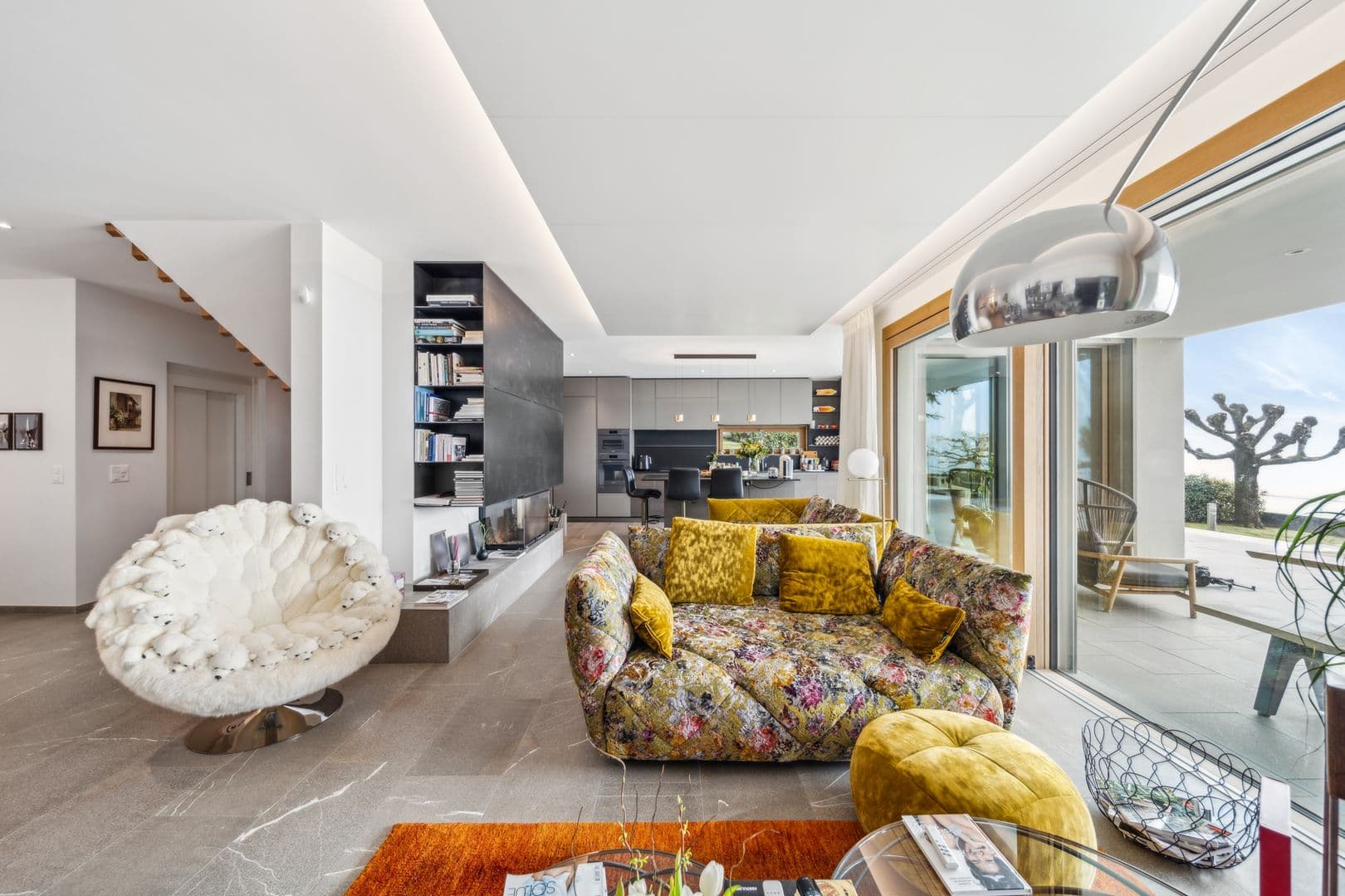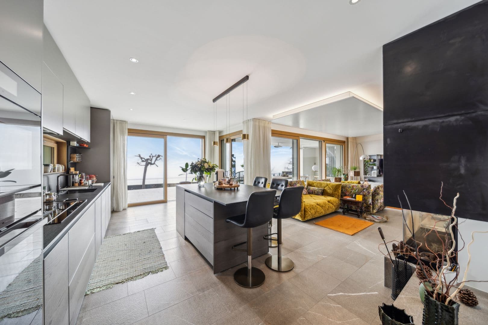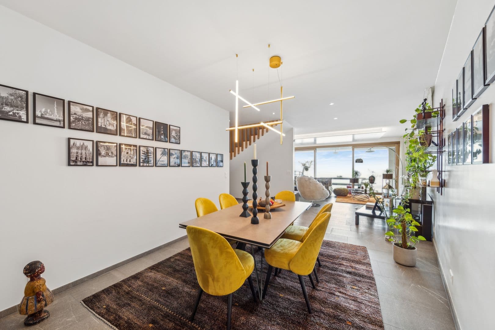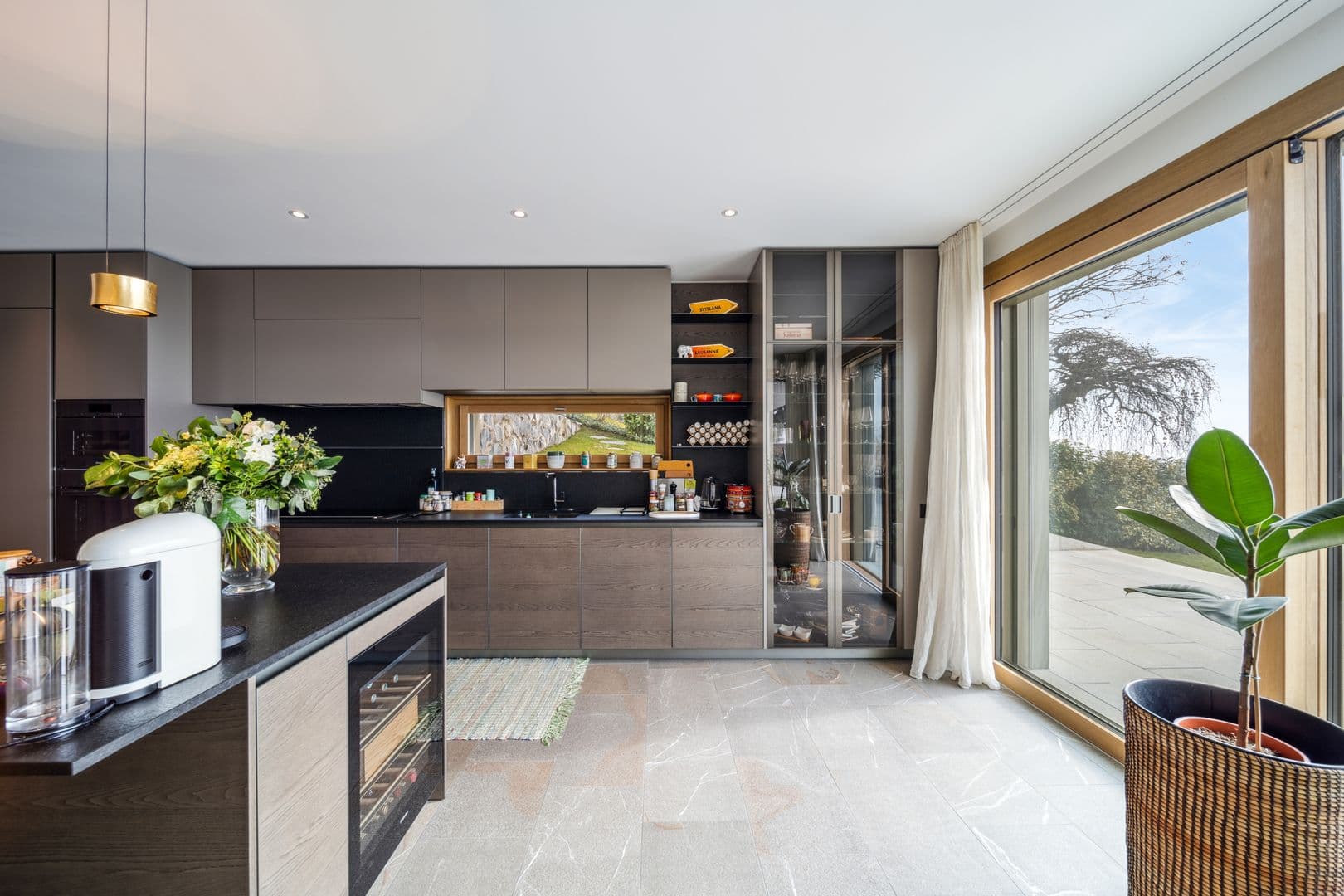 Rez-de-jardin: La cuisine moderne entièrement équipée avec un îlot central est un véritable cœur de la maison, ouverte sur un coin salon avec cheminée et donnant sur la terrasse. L’espace salle à manger est lumineux et spacieux, parfait pour recevoir. Un vestibule, un garde-manger et des toilettes visiteurs complètent ce niveau.