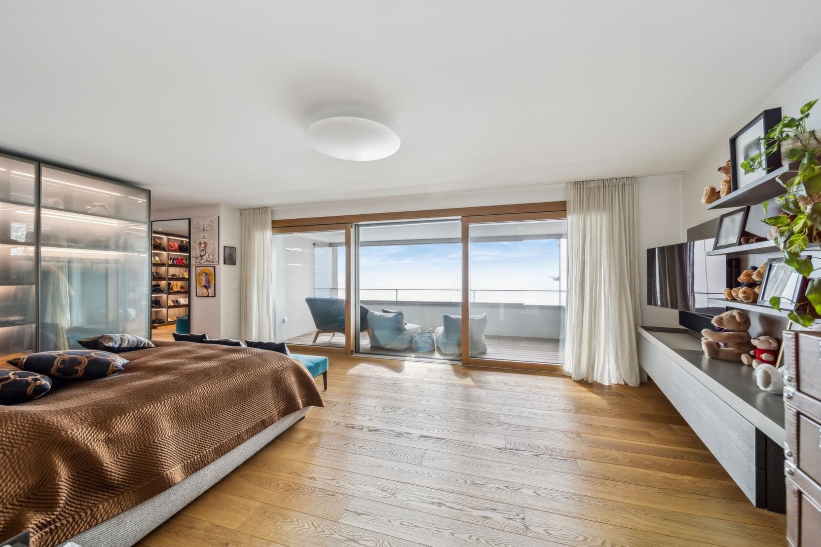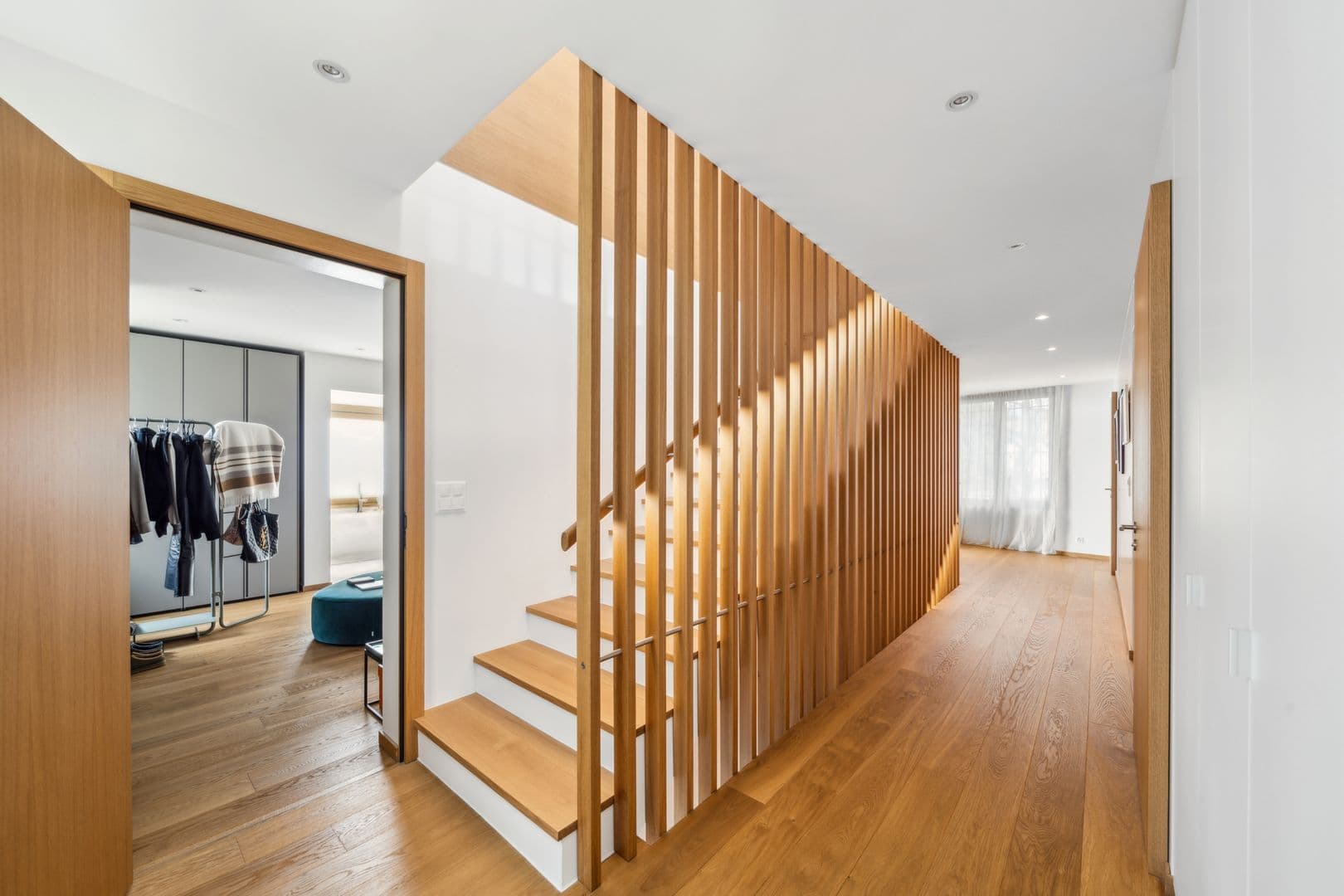 1er étage: La chambre parentale occupe toute la partie sud de la maison, avec un balcon couvert, un dressing spacieux et une salle de bains en suite. Vous y trouverez également une deuxième chambre et une troisième actuellement aménagée en dressing, mais disposant d’une salle de bains en suite, offrant ainsi une grande flexibilité d’aménagement.