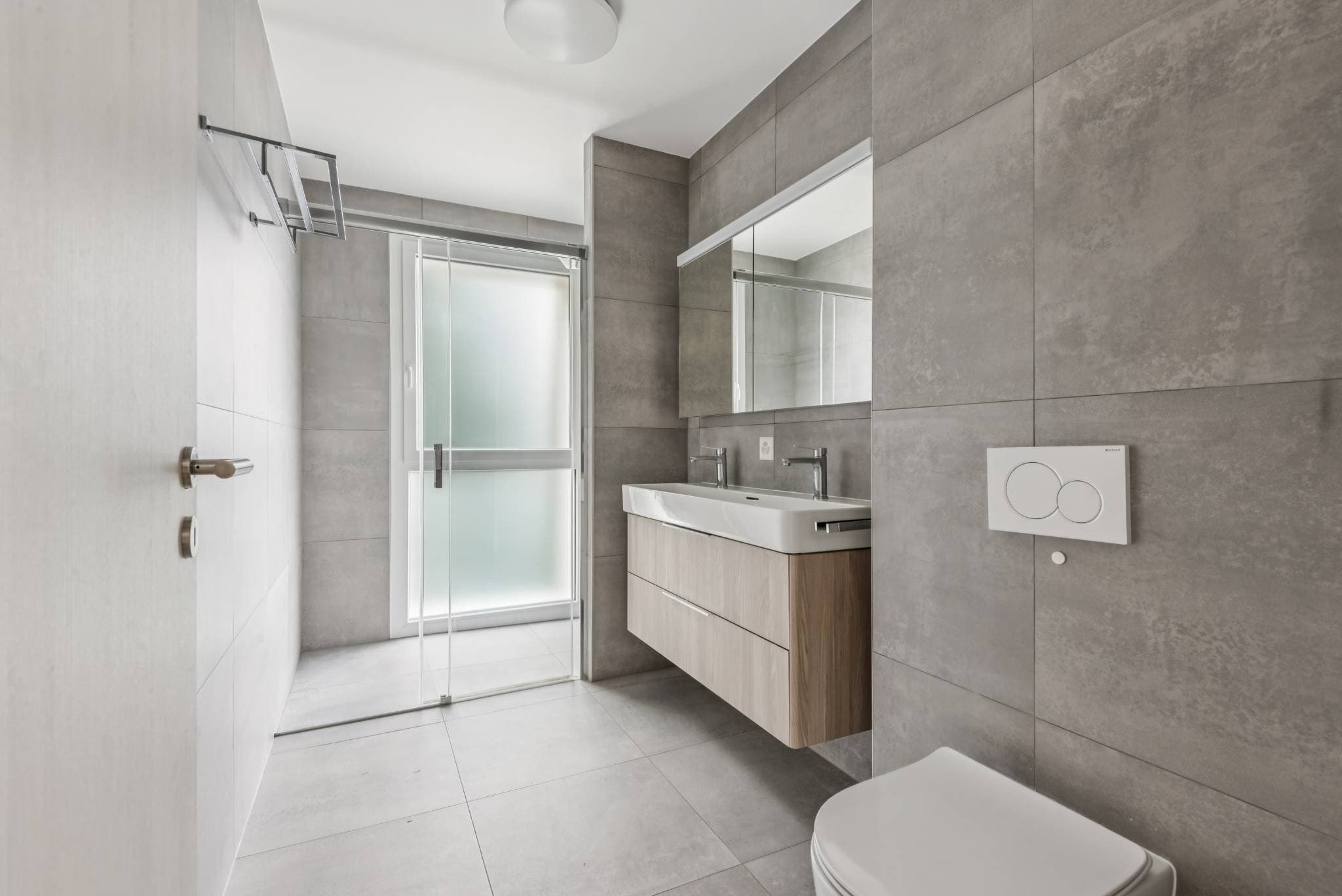 L’entrée de la villa se situe à l’étage supérieur, où un hall lumineux accueille les occupants dès leur arrivée et donne accès à un garage double équipé d’une porte motorisée, offrant une entrée pratique et confortable.