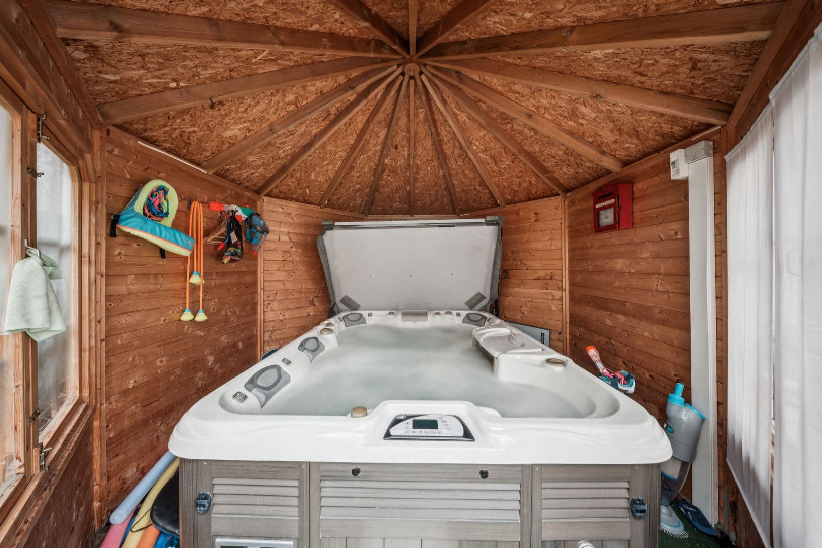 La propriété est complétée par un jacuzzi, un sauna, un atelier et une piscine dans un jardin entièrement clôturé.