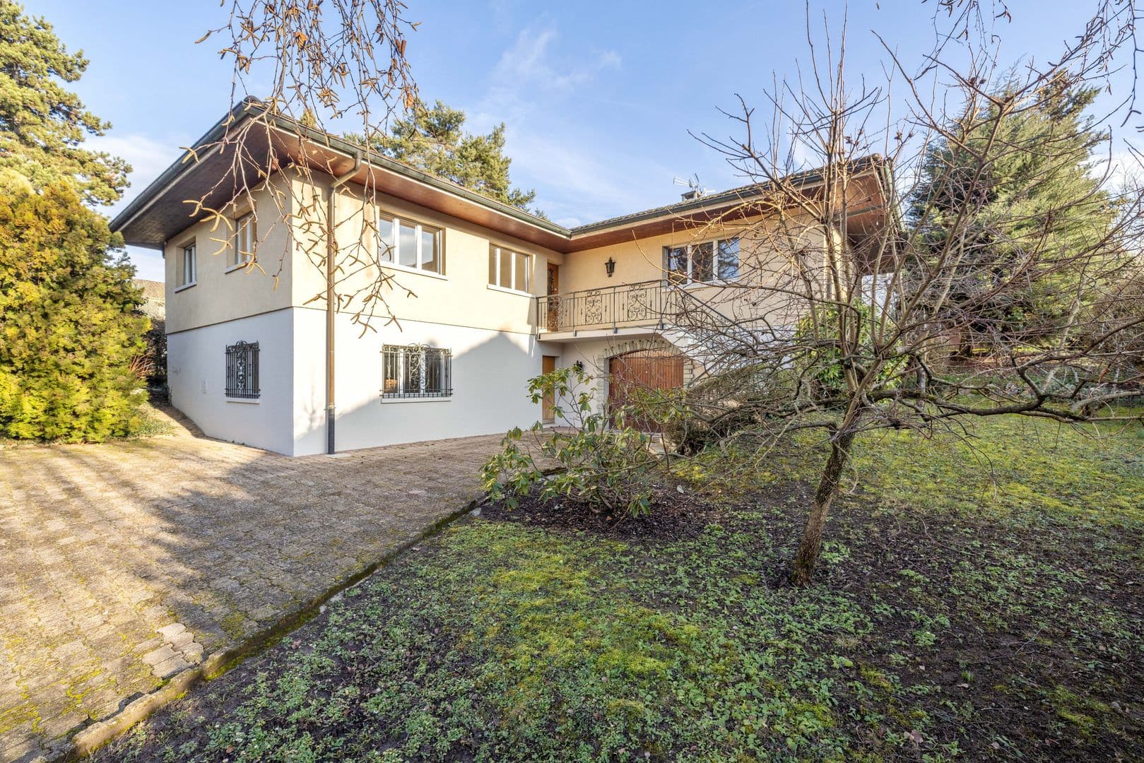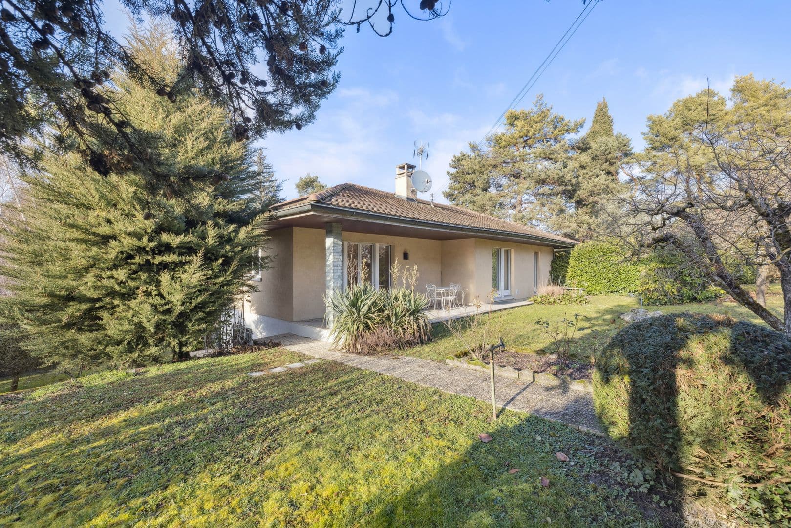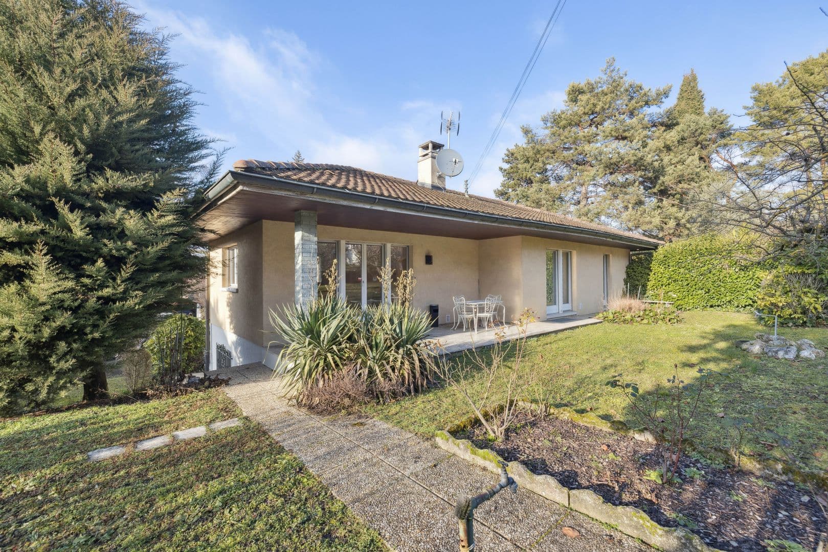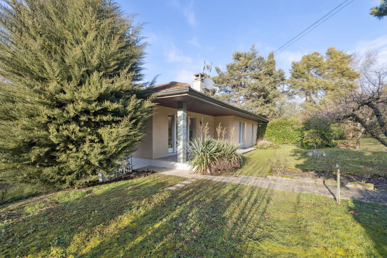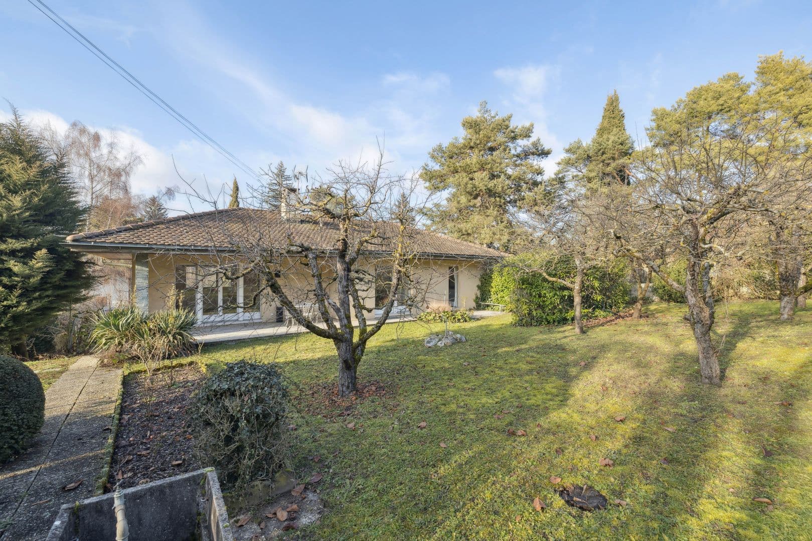 Cette belle villa individuelle de plain-pied a été construite dans les années 70 sur une grande parcelle de 1'088 m². Avec 8 pièces, elle compte 4 chambres à coucher pour une surface habitable d'environ 160 m² et une généreuse surface utile d'environ 320 m².