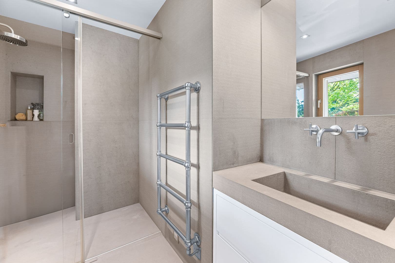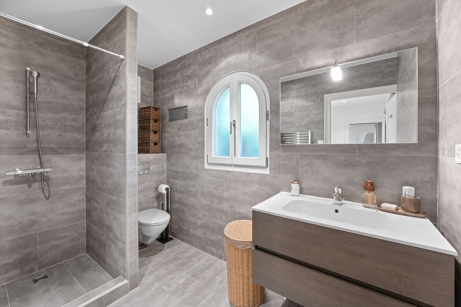 La propriété, rénovée entièrement en 2014, dispose au rez-de-chaussée d'un grand bureau, d'un WC visiteur, d'une grande pièce de vie, d'une salle à manger avec une grande cuisine ouverte. Une salle de douche avec entrée indépendante complète cet étage.