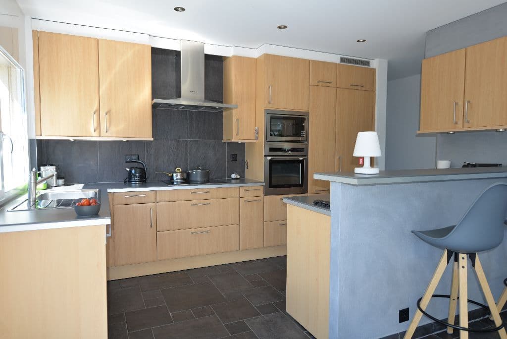 L'agencement intérieur, avec sa cuisine ouverte sur un séjour avec poêle à bois ajoutent une touche moderne et cosy.