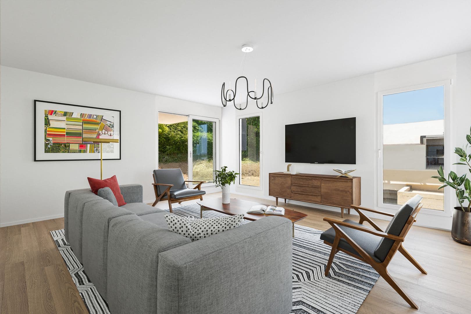 Tous les logements se composent de 5.5 pièces, dont 4 chambres, sur deux étages. Chaque maison possède un vaste jardin, une terrasse et un grand garage.