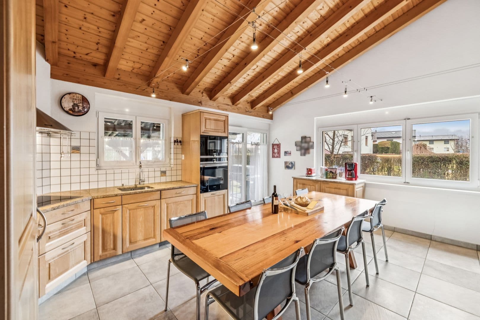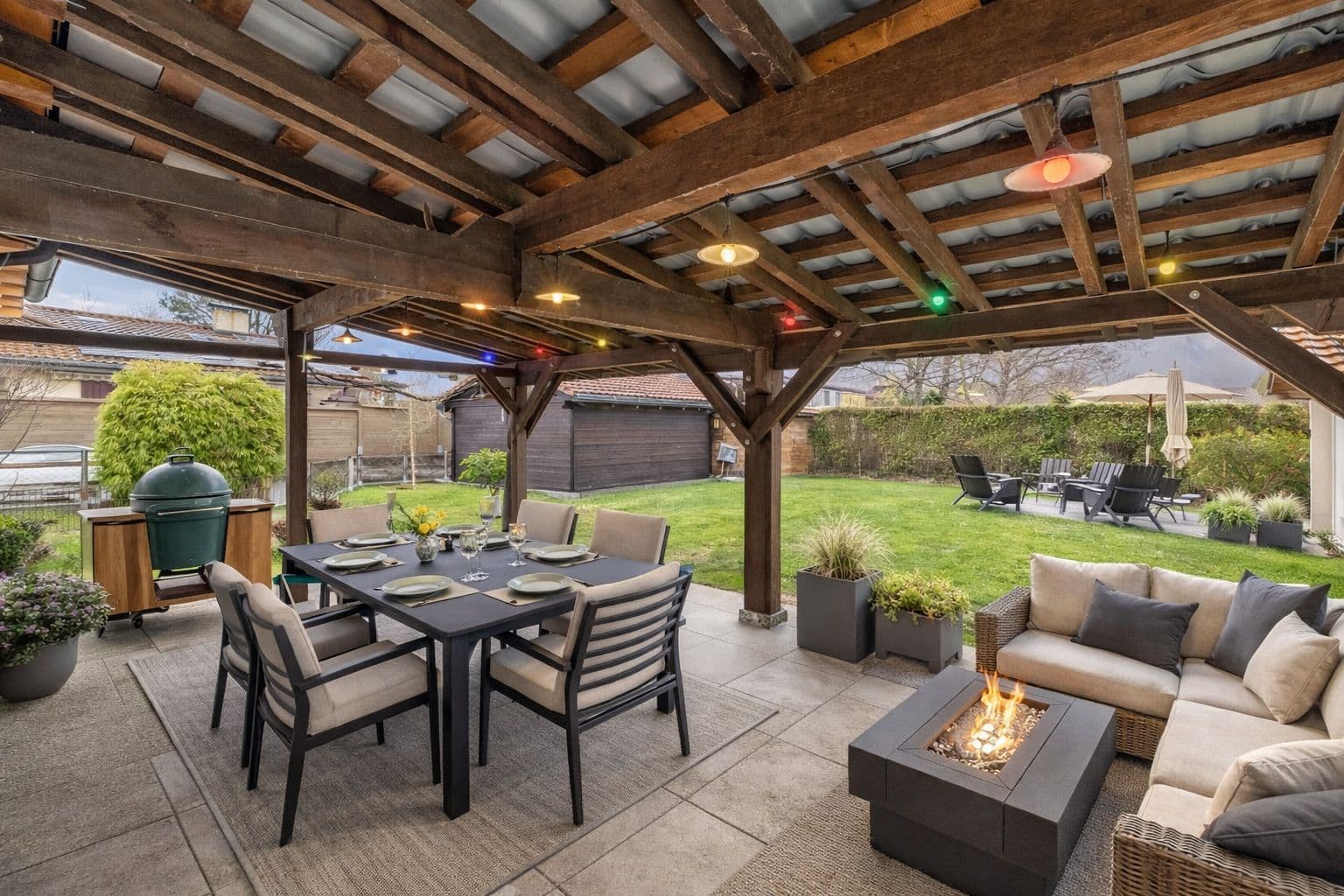 À l’extérieur, laterrasse couverte de 28 m² prolonge les espaces de vie et invite à profiter pleinement des beaux jours. Unterrain de pétanque,desplaces de parc couvertes ainsi qu’un aménagement extérieur soigné complètent cette propriété pensée pour la convivialité et la vie de famille.