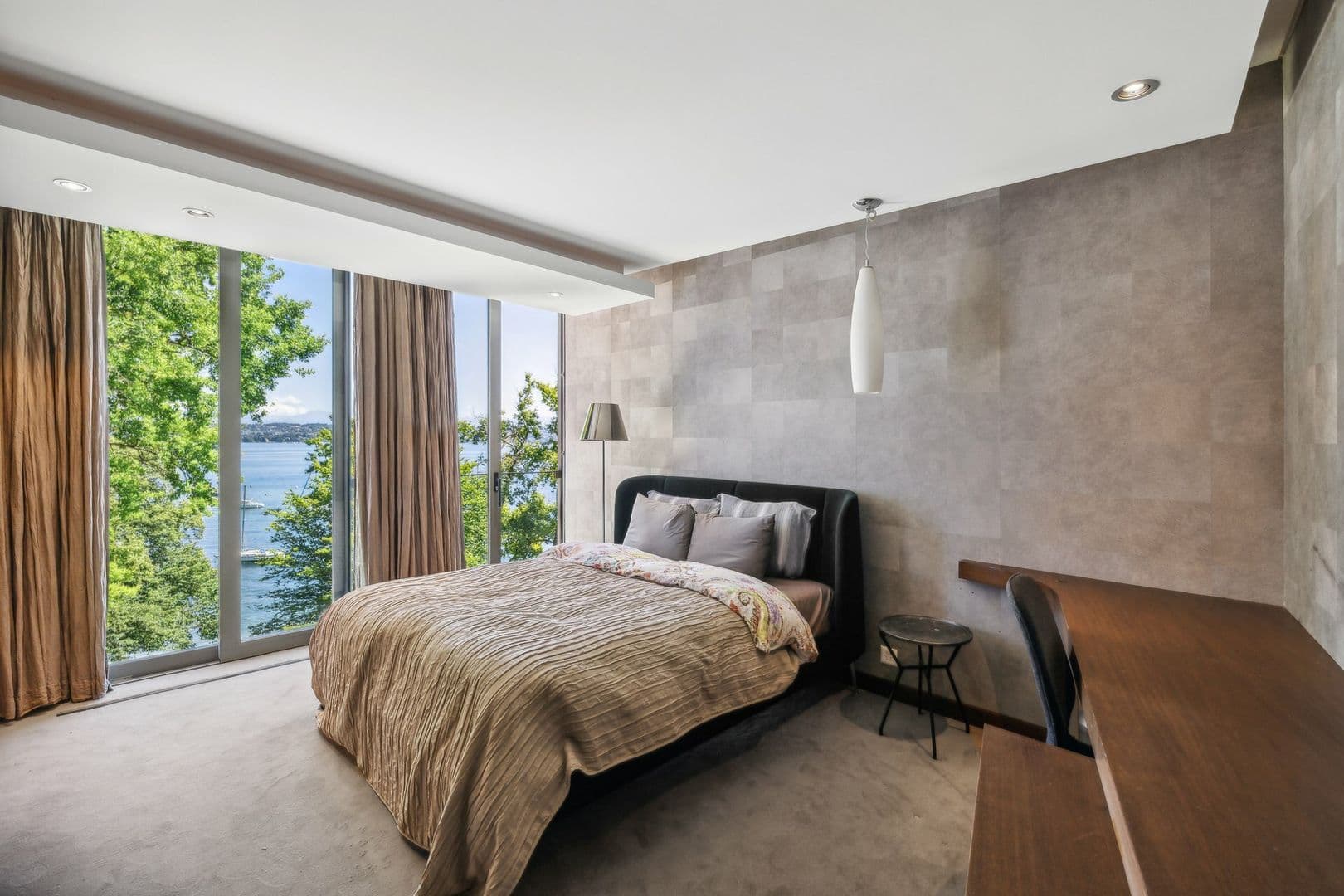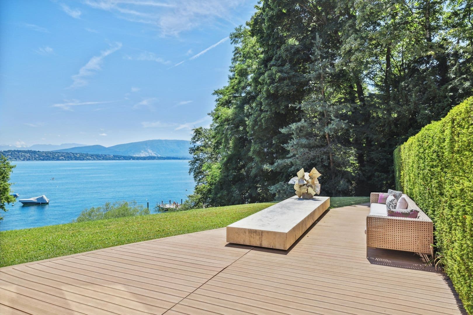 A l'extérieur, ses convives pourront se reposer sur son terrain arboré avec piscine ou organiser des réceptions sur ses larges terrasses face au lac.