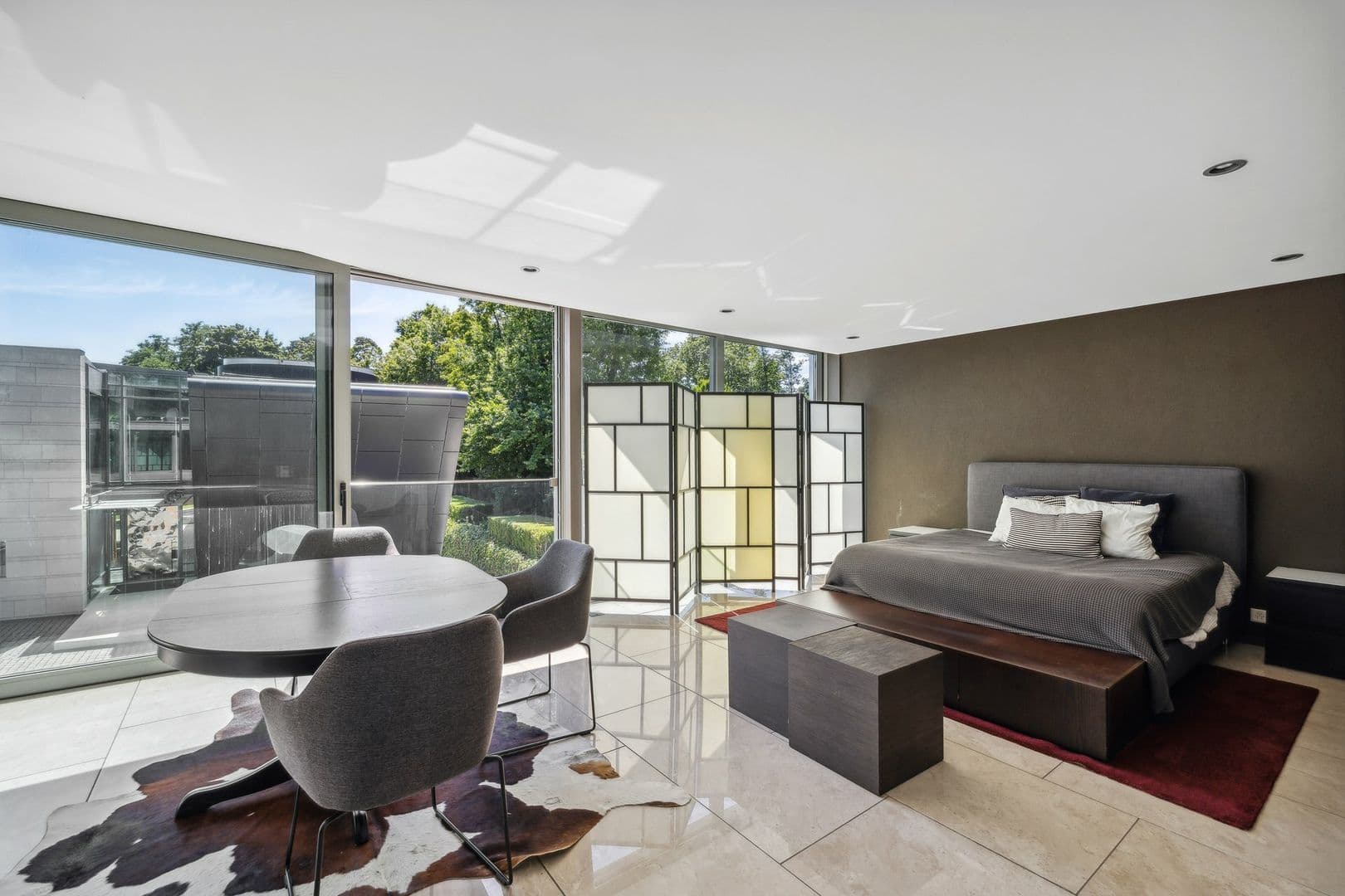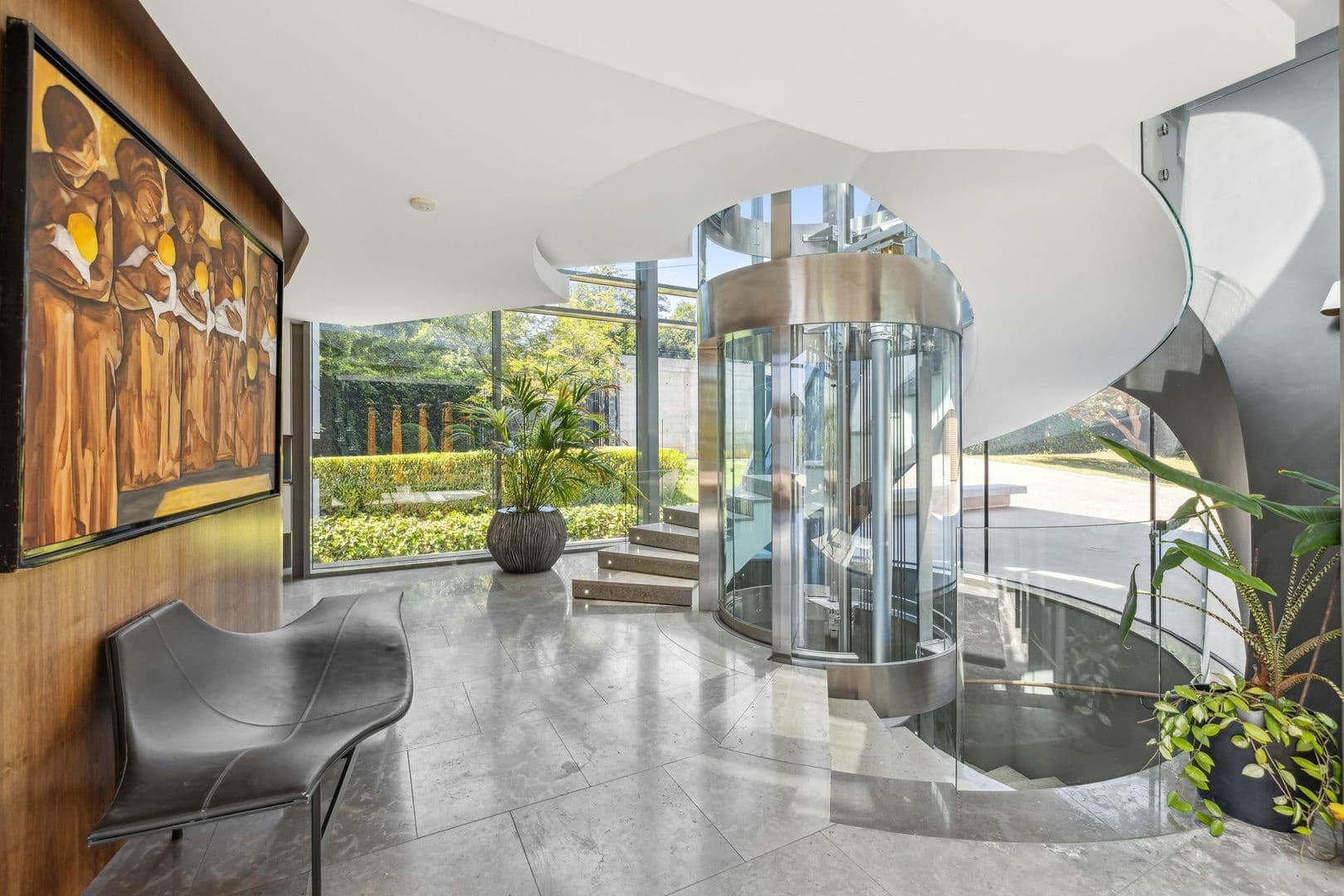 La partie nuit est desservie par un superbe ascenseur en verre qui s'ouvre sur une mezzanine vitrée donnant sur le salon du rez-de-chaussée.