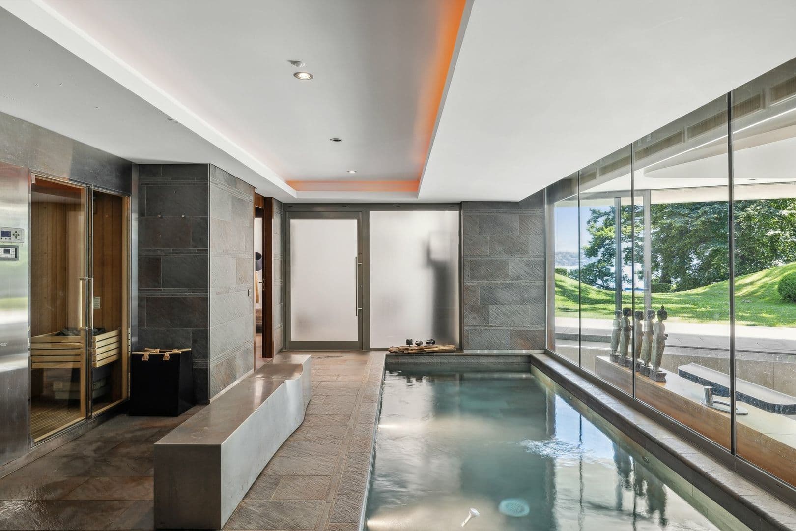 Le sous-sol offre de nombreuses possibilités quant à l'aménagement. Aujourd'hui, il dispose d'un grand espace showroom pour les voitures de collection, d'un immense garage, d'une salle de conférence, d'un bureau et d'un espace SPA avec piscine intérieure, sauna, hammam et salle de musculation.