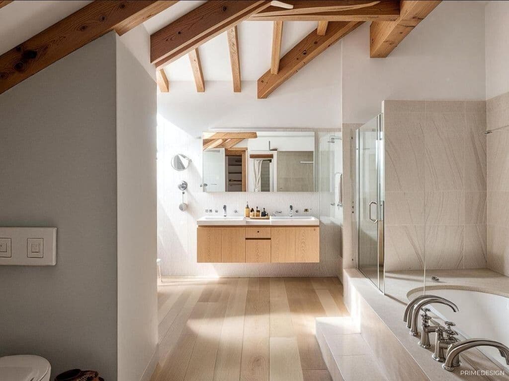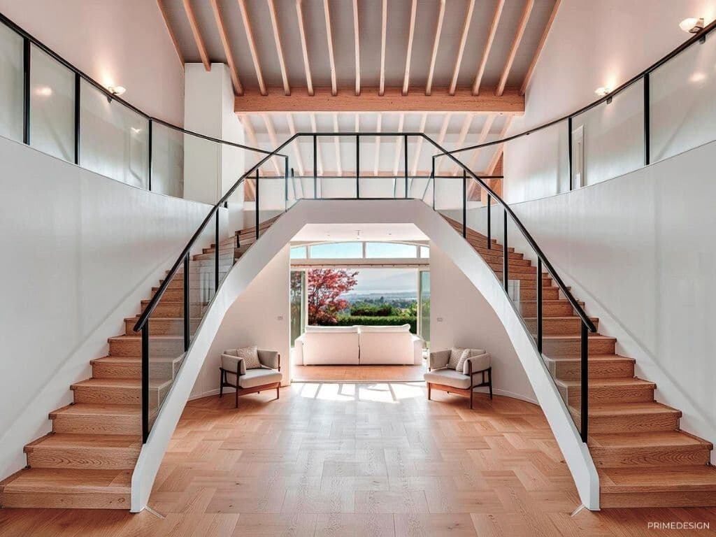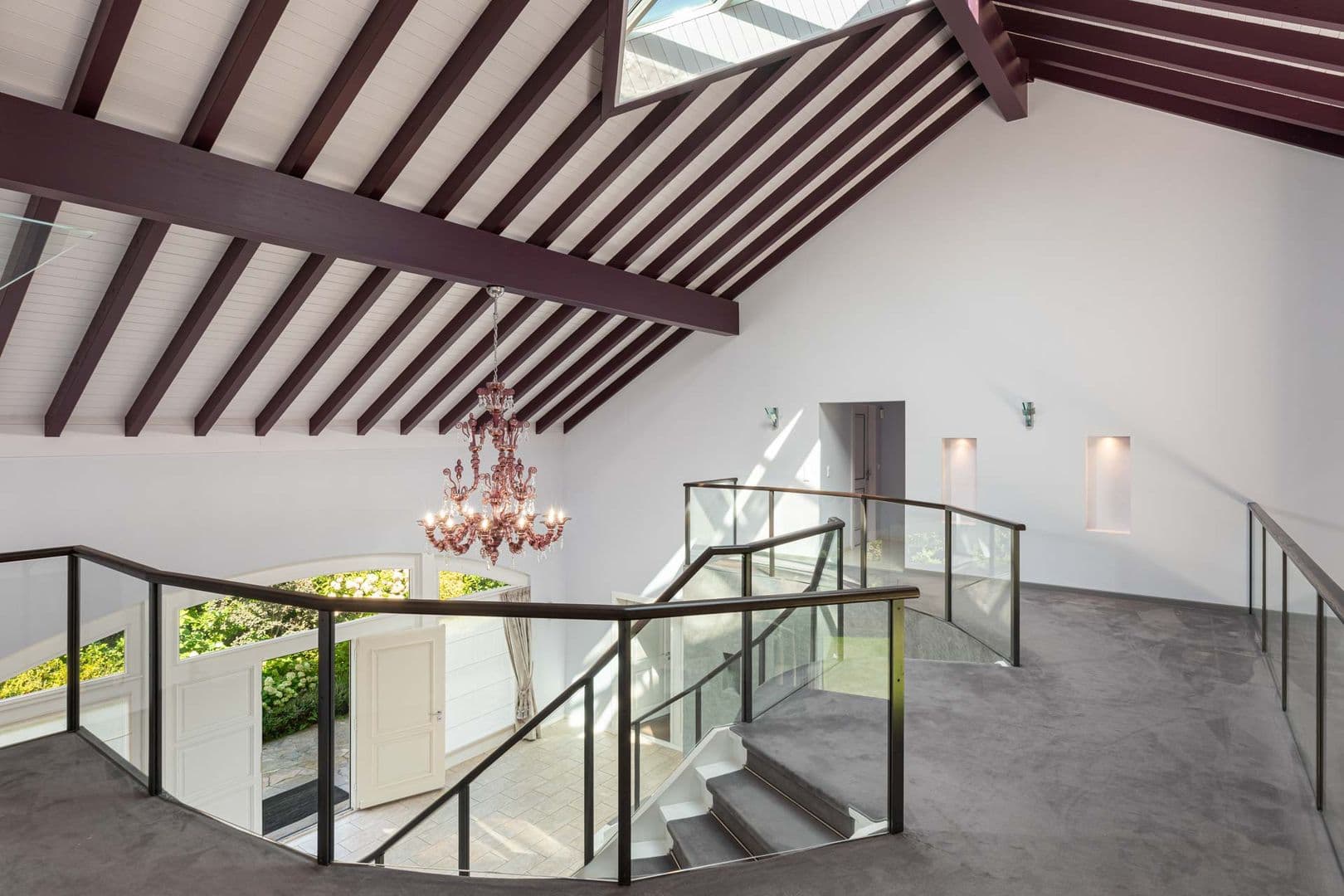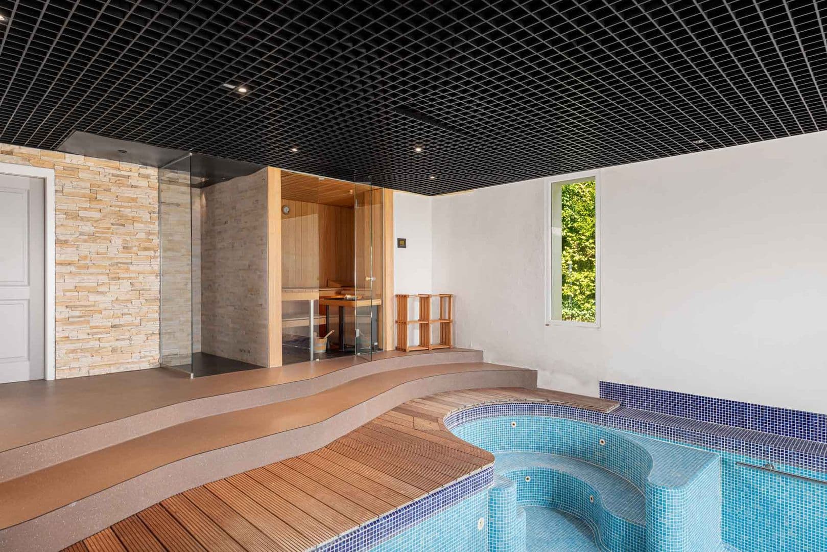 La piscine intérieure, entourée de baies vitrées, permet de s'évader tout au long de l'année, tandis que la hauteur sous plafond dans les espaces de vie accentue la sensation d'espace et de lumière.