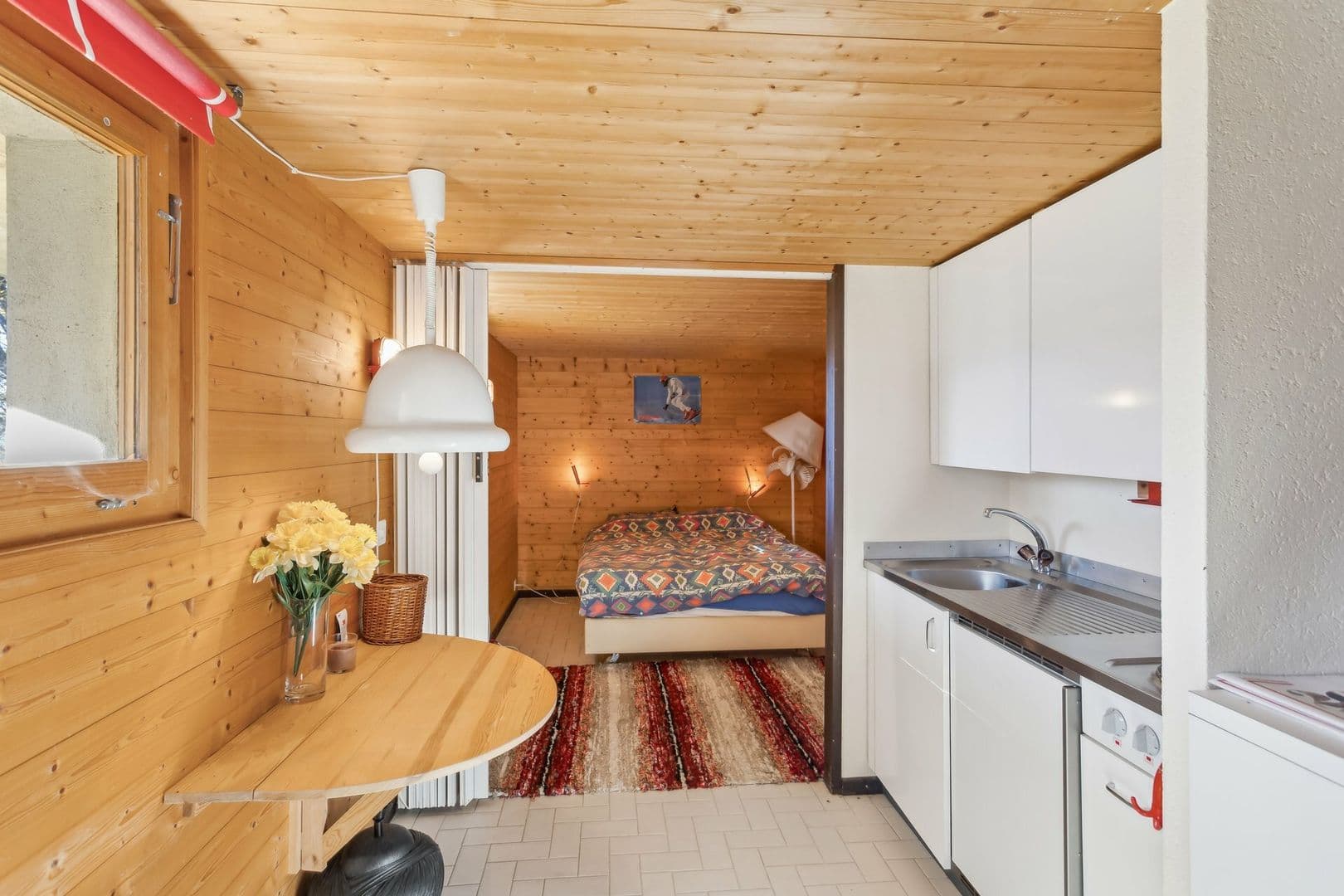 Le chalet construit en 1979 sur 3 niveaux demandera quelques rafraîchissements. Le rez offre un vaste séjour avec cheminée et un espace à manger, le tout ouvert sur le balcon Sud et sa vue spectaculaire sur les Alpes. L'étage est complété par une cuisine ouverte, d'une chambre d'invités et d'une salle de douche et d'un wc séparé.