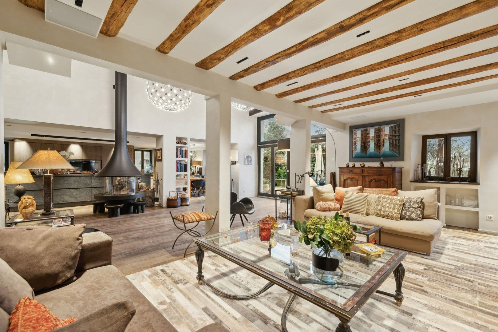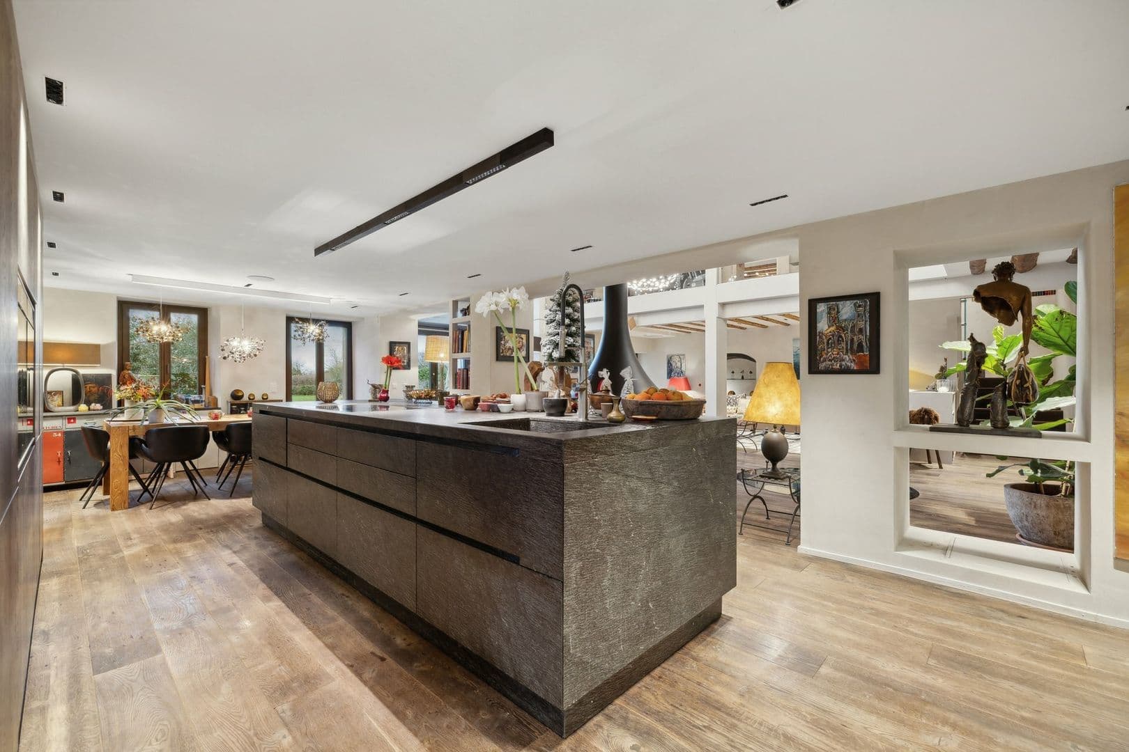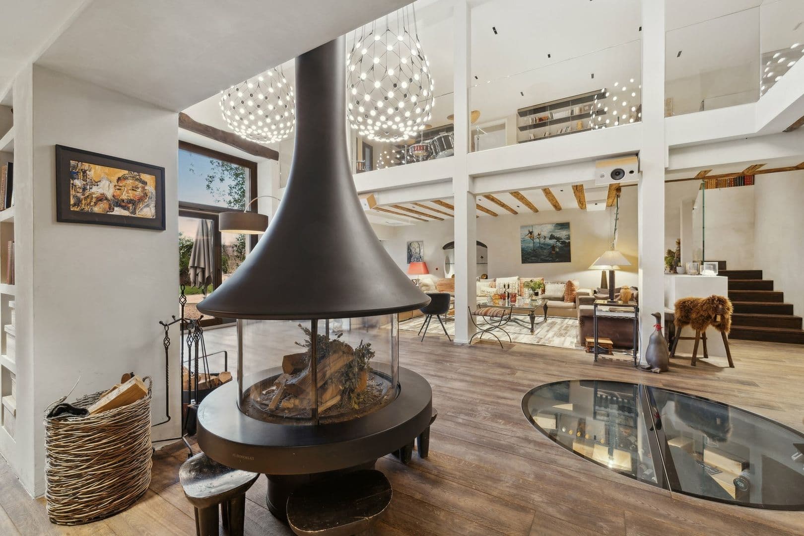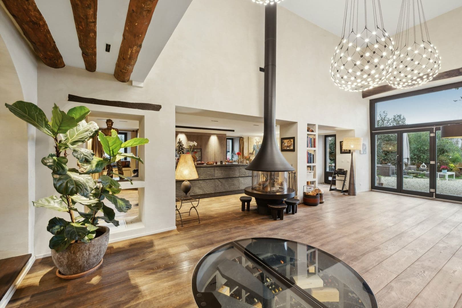 La partie jour offre de très belles et lumineuses pièces. Vous serez séduit par un grand espace commun regroupant la cuisine ouverte, le salon et la salle à manger, autour d'un poêle suédois central. Une grande cave vitrée, visible depuis le séjour, apporte du charme à cet espace.