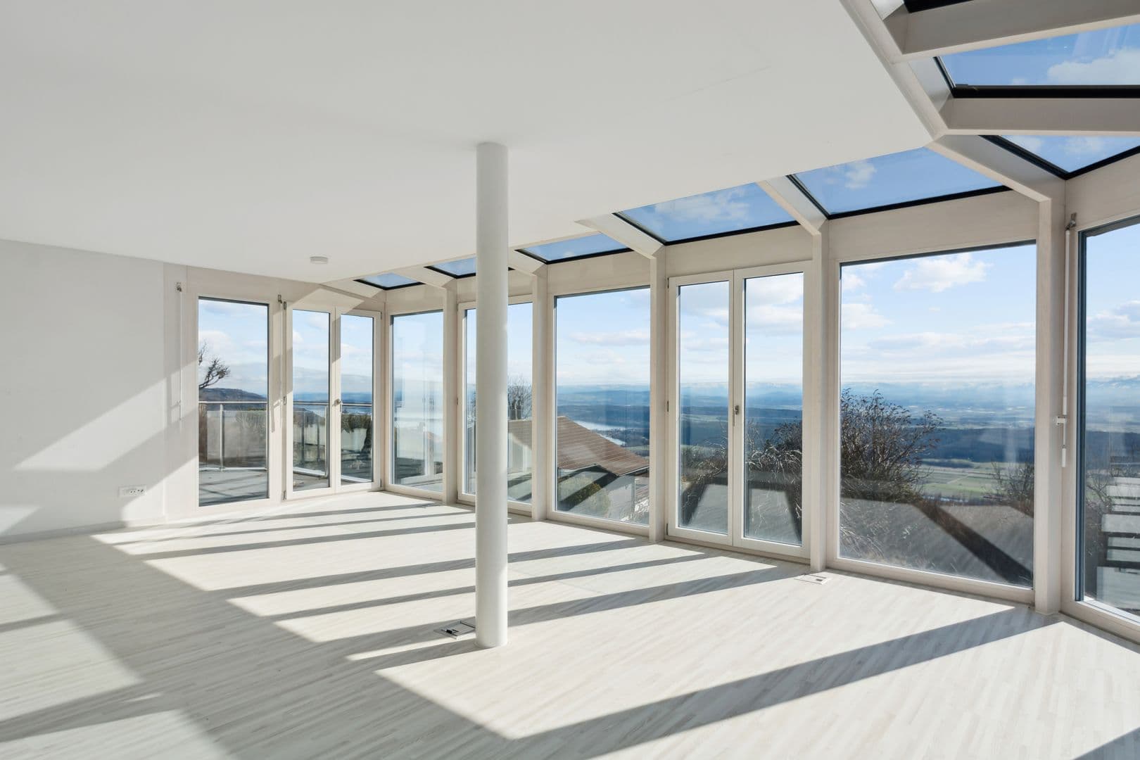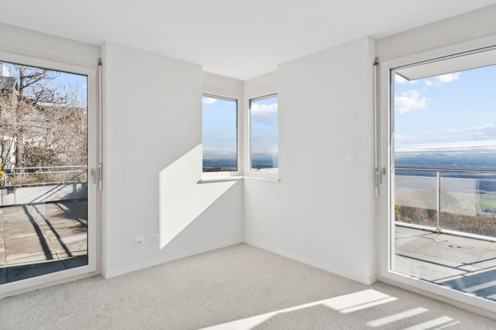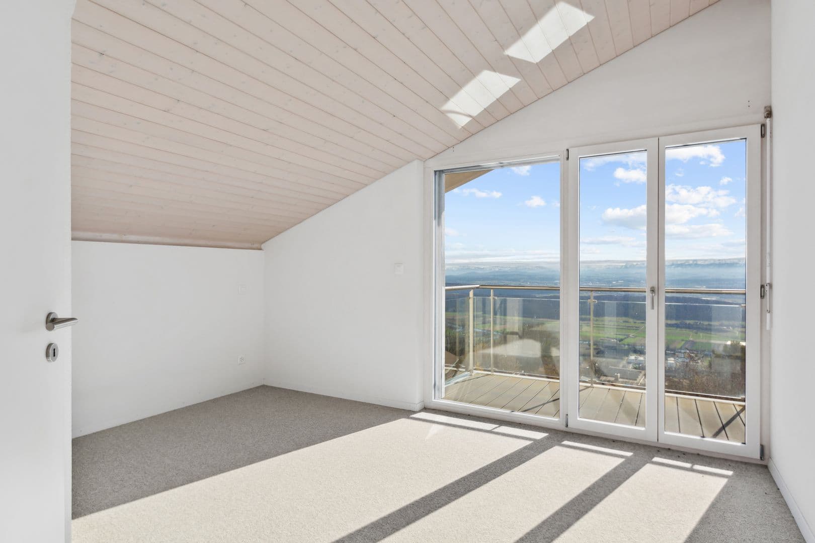 Située sur les hauteurs d’Enges, dans le canton de Neuchâtel, cette élégante maison individuelle de 6,5 pièces, construite en 2015, bénéficie d’une vue panoramique exceptionnelle sur les Trois-Lacs.