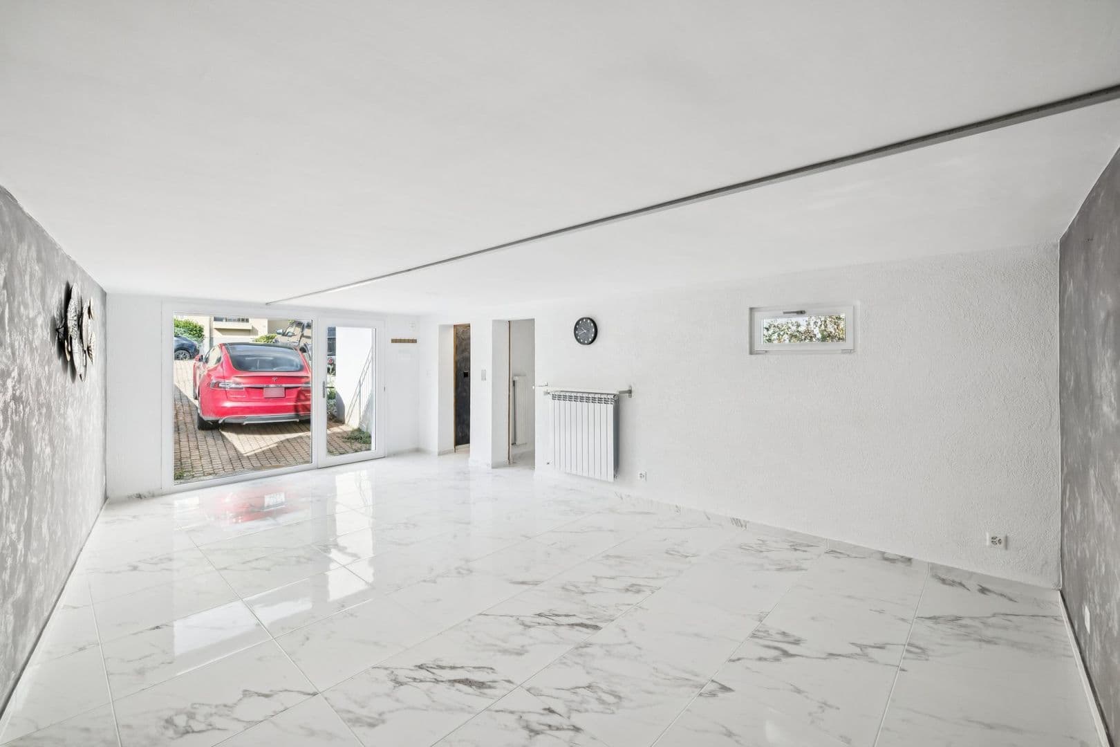 Le garage a laissé sa place à une grande pièce chauffée et totalement habitable, baignée de lumière grâce à sa baie vitrée.