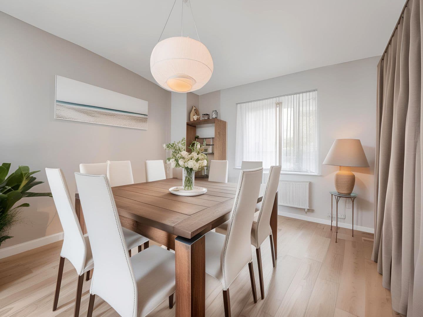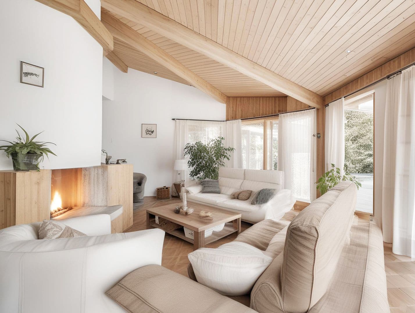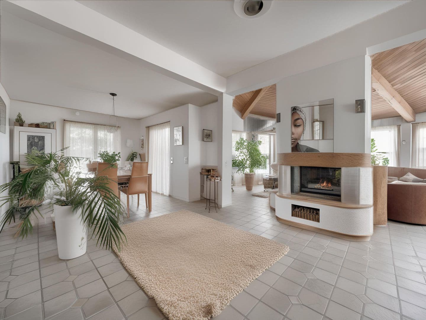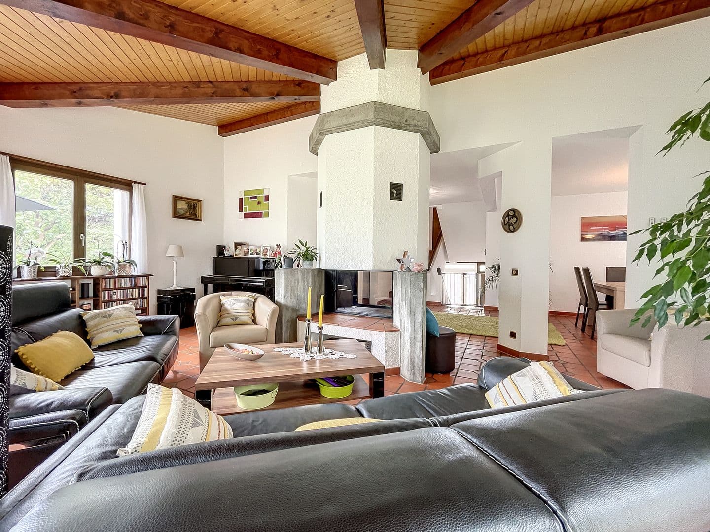 Le vaste séjour est l'un des points forts de cette villa, avec sa cheminée traversante qui ajoute une touche chaleureuse et conviviale. Les grandes fenêtres du séjour permettent de profiter d'une vue agréable sur le jardin et les environs.