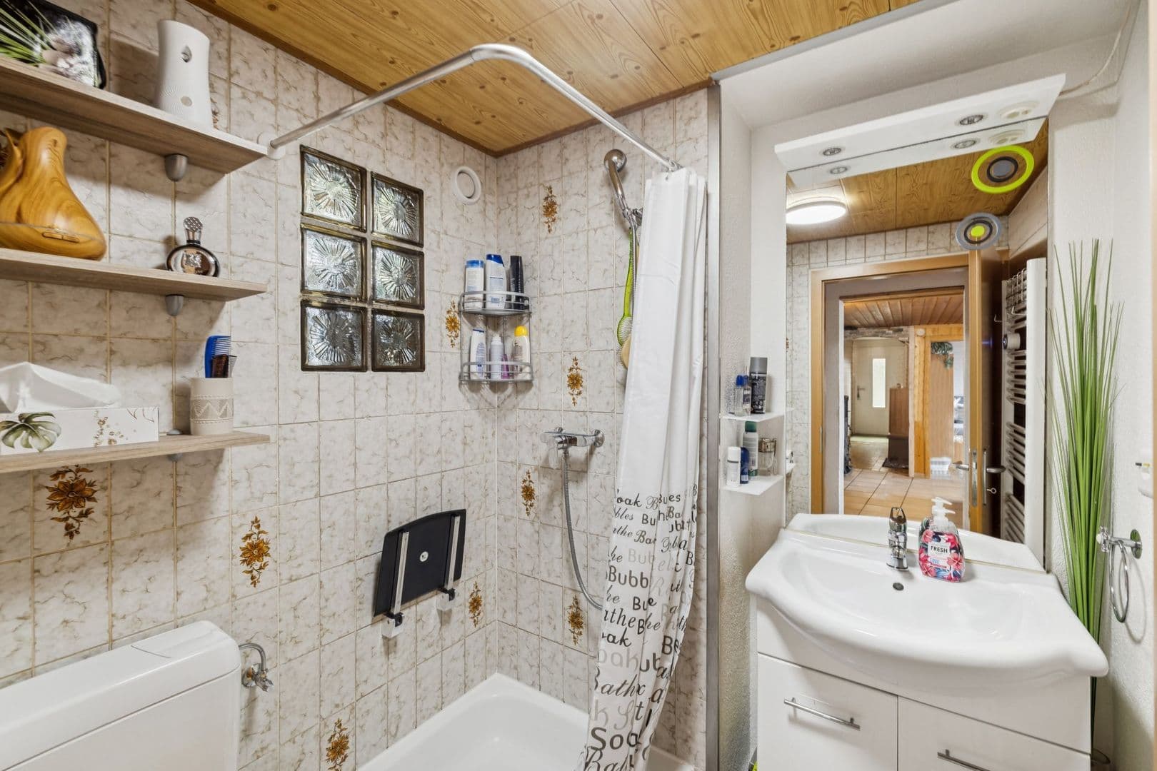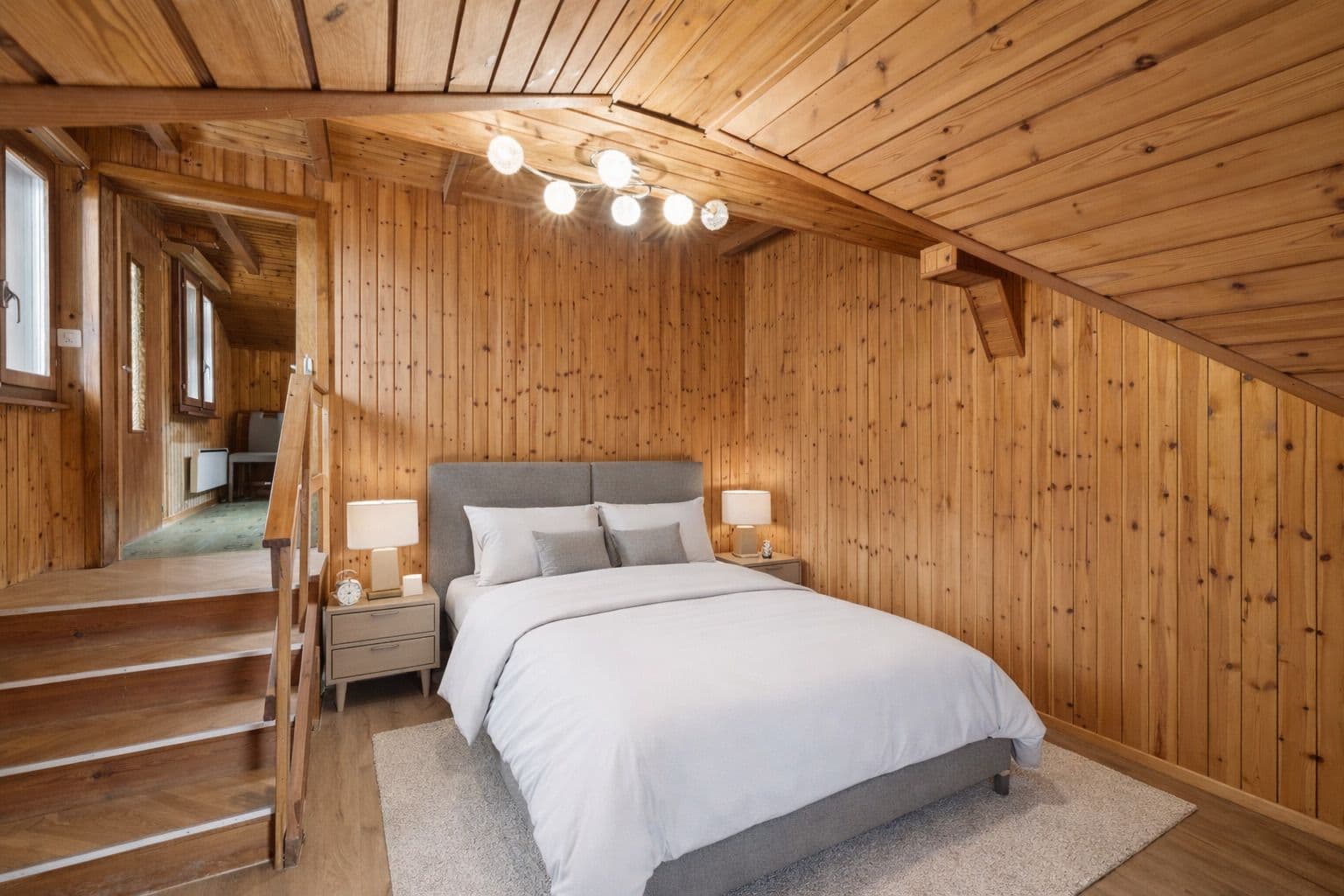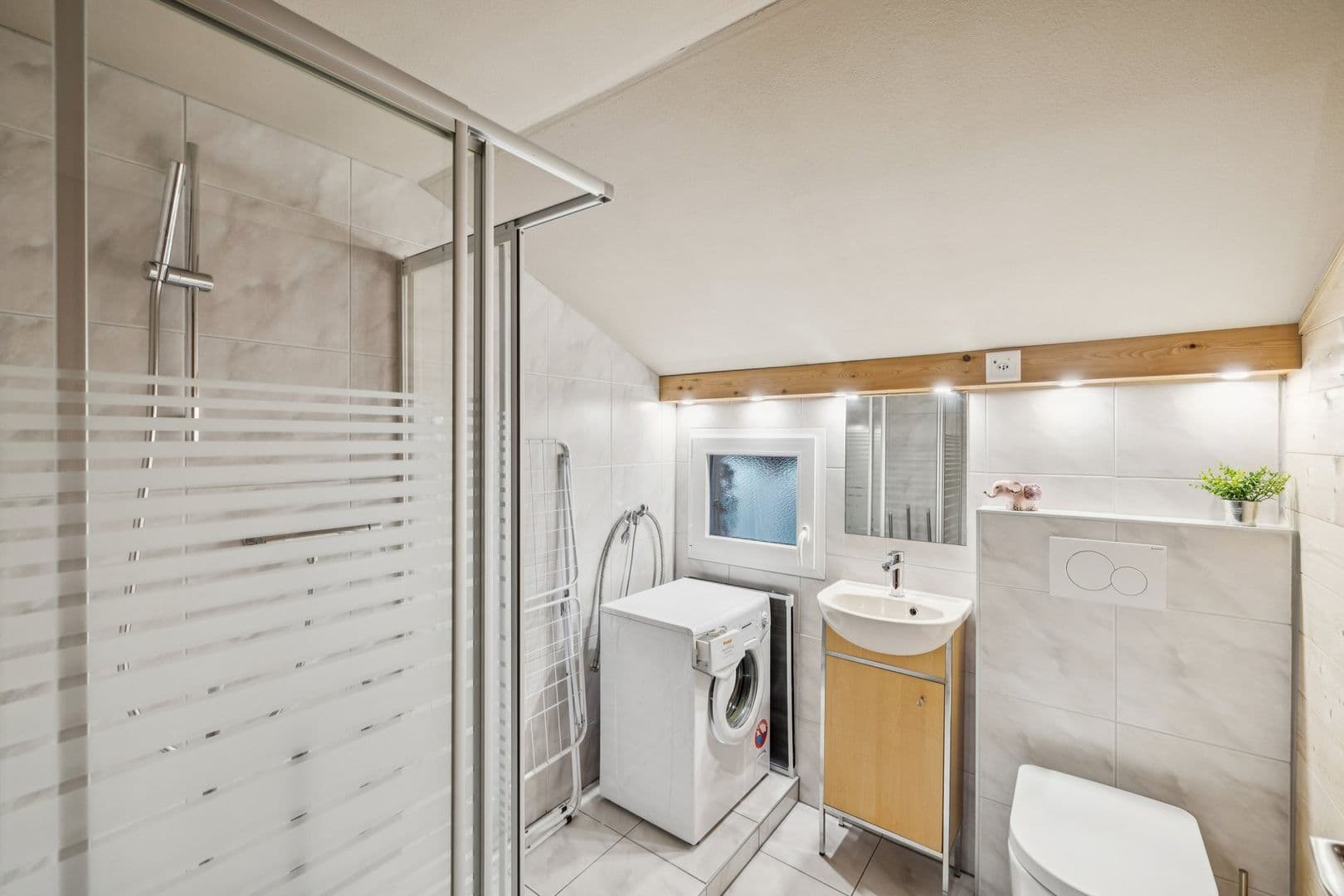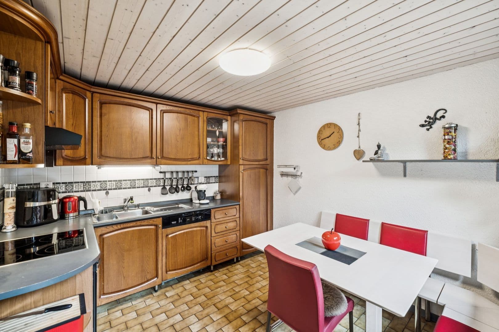 La maison offre un réel potentiel d'agrandissement ou de modification avec son étage inférieur qui pourrait être rendu habitable ou utilisé comme atelier. Elle dispose actuellement de deux logements distincts avec accès indépendants. Le logement principal est un appartement de 3.5 pièces avec buanderie privée. Il a déjà été complètement rénové. L'autre appartement est un 2.5 pièces et pourrait être rafraîchi.