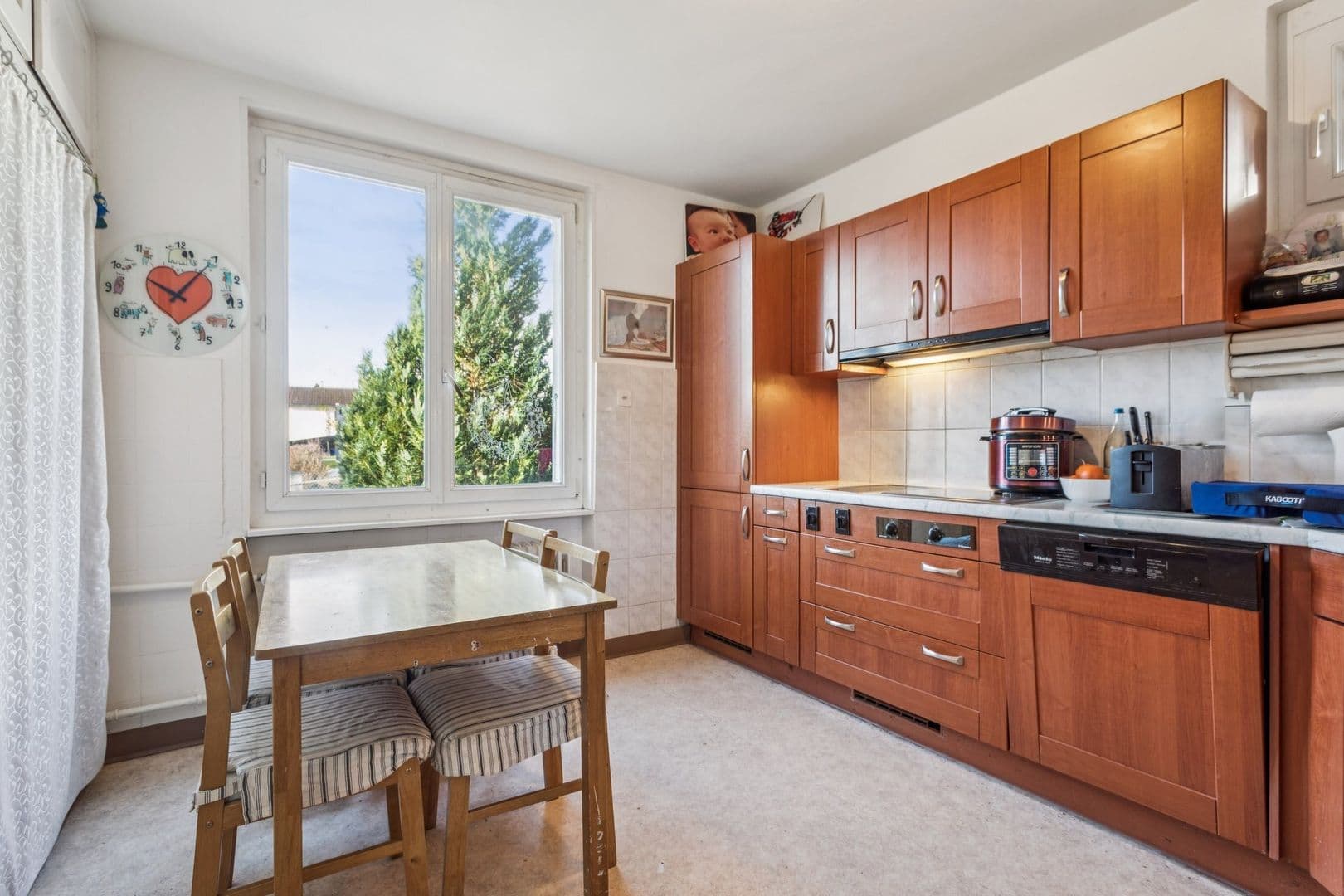 Le rez-de-jardin offre une entrée accueillante, un WC visiteurs, une cuisine fermée et un salon spacieux, agrandi grâce à l’unification avec une ancienne chambre.