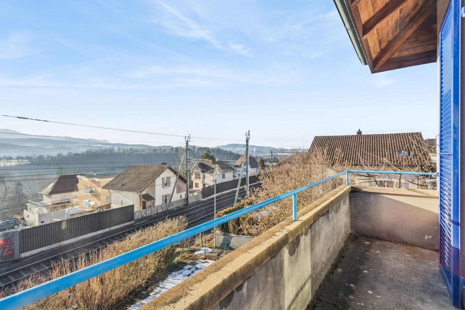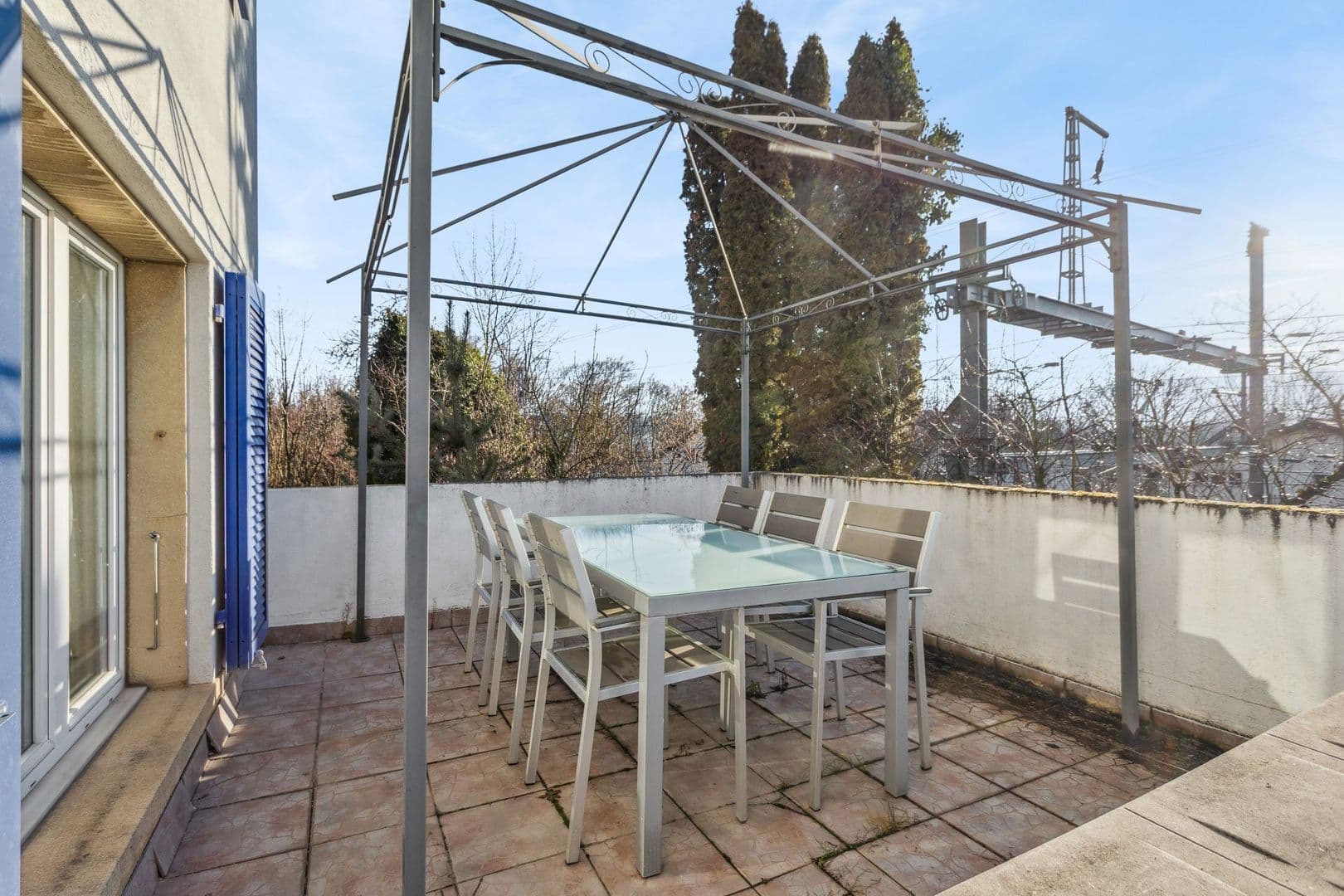 À l’étage supérieur, on trouve trois chambres à coucher, dont une chambre parentale avec accès direct au balcon, une salle de bains ainsi qu’un escalier menant aux combles, offrant un espace de rangement supplémentaire.