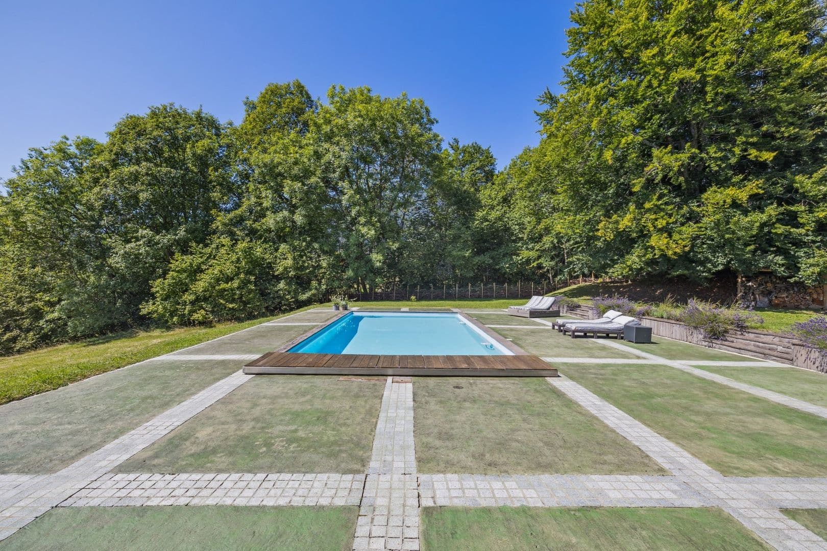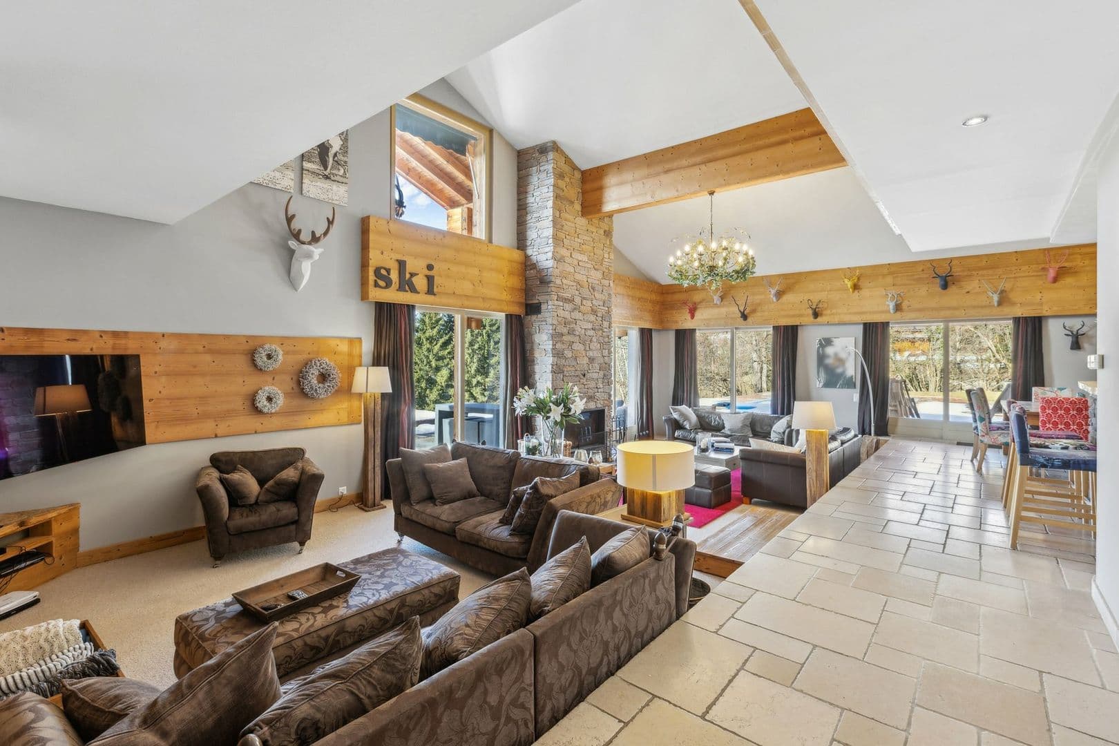 Les extérieurs : le pourtour du chalet est dallé et présente un bel espace de détente abrité avec un jacuzzi. La partie Nord comprend une belle piscine extérieure entourée des espaces pour les transats.