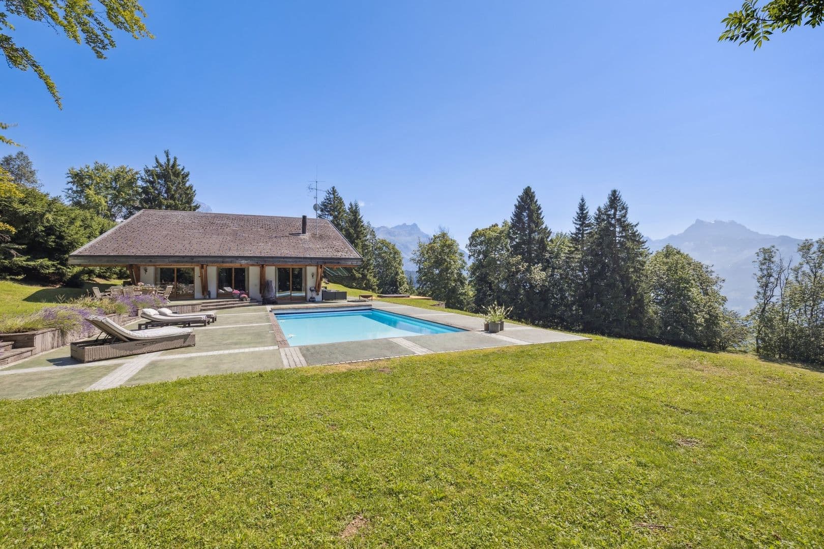Implanté sur une parcelle plane de presque 2'300 m2 sans vis-à-vis avec un accès privatif, la propriété bénéficie d'une magnifique vue sur les Alpes, les champs et les forêts. L'ensoleillement y est optimal du matin au soir.