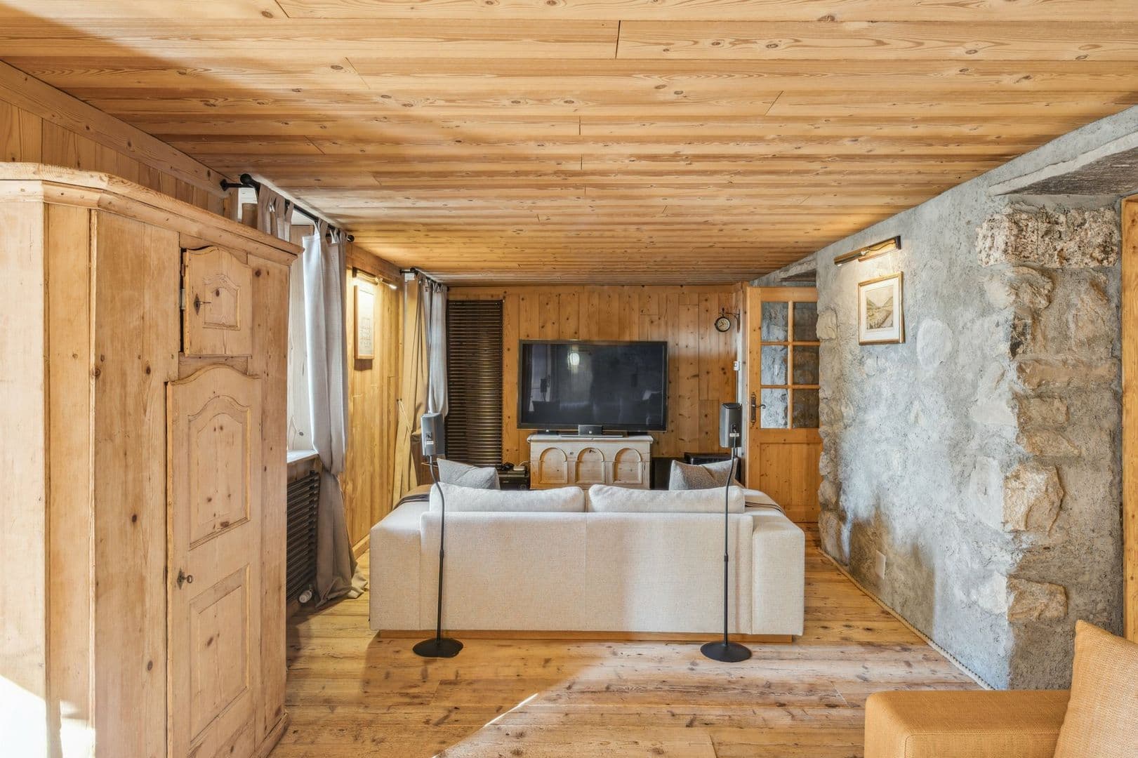 Le dernier étage aux combles comprend la chambre parentale avec espace bureau, cheminée et un balcon Sud, offrant une vue spectaculaire la station et les Alpes. Une chambre ou bureau ainsi qu'une salle de bains complètent l'étage