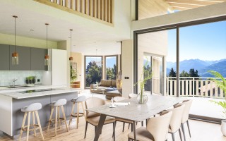 Situé dans un quartier résidentiel à l’abri du bruit et en contact direct avec la nature, ce chalet individuel bénéficie d’un ensoleillement sud-ouest optimal et d’une vue panoramique dégagée sur les Alpes.