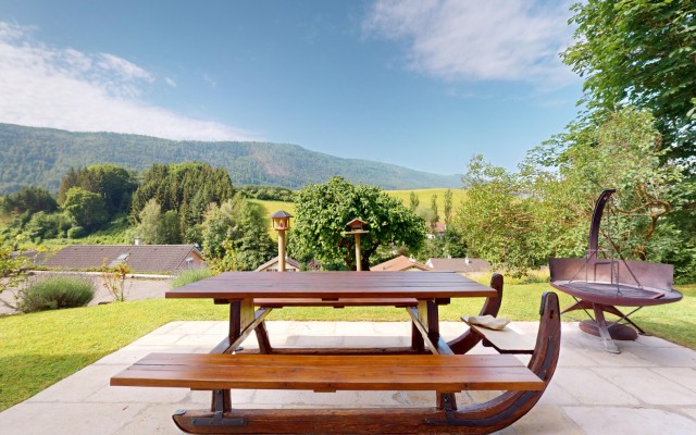 Le terrain de 1’058 m² offre une intimité préservée. Le jardin de 519 m², plat et parfaitement entretenu, constitue un terrain d'expression idéal pour des réceptions en plein air ou des moments de détente face au panorama jurassien.