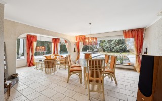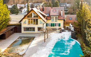 Implantée dans un quartier résidentiel paisible et verdoyant de Cugy, la maison s’intègre harmonieusement dans son environnement. Le jardin soigneusement aménagé constitue un véritable havre de paix arboré, agrémenté d’une piscine à débordement chauffée et de plusieurs terrasses en bois.