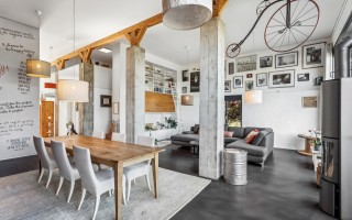 Les belles poutres apparentes, le béton brut, le béton ciré et le poêle suédois offrent une ambiance chaleureuse à l'imposante pièce à vivre accentuée par une bibliothèque murale.