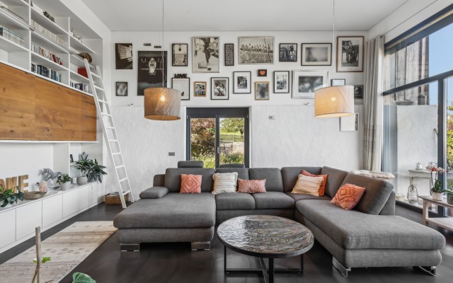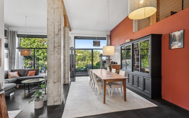 La belle mezzanine à l'étage dispose d'une vue plongeante sur cette dernière qui est baignée de lumière grâce à la vaste hauteur sous plafond.