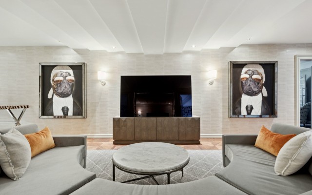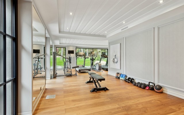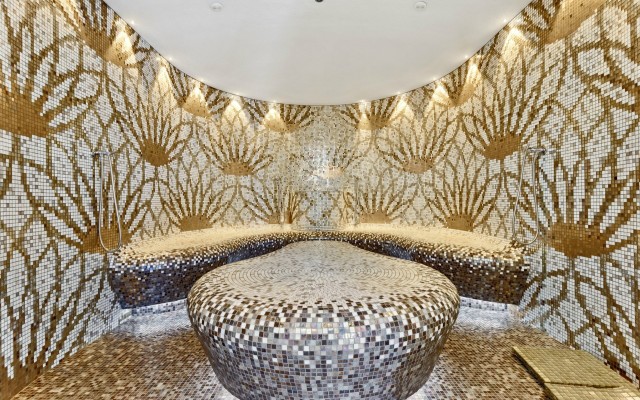 Pour le bien-être, le rez-de-chaussée comprend un hammam incrusté d’or, un salon de coiffure, un salon de manucure et une salle de sport. La chambre de maître dispose d’un salon avec cheminée, de deux dressings sur deux étages, et d’une salle de bains avec accès à une terrasse privative équipée d’une douche, d’une cheminée et d’un jacuzzi.