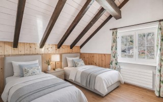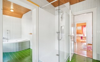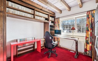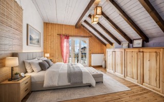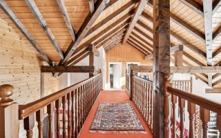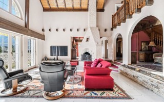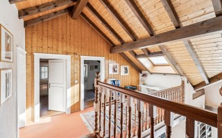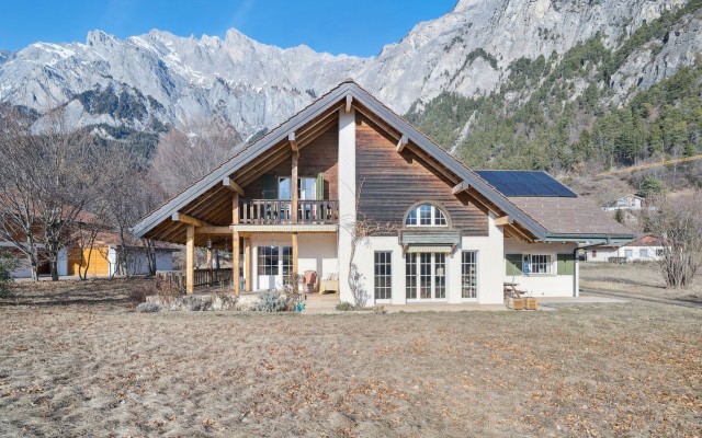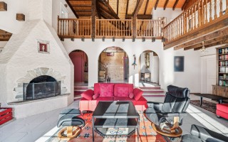 La maison offre de magnifiques volumes notamment grâce à son immense vide sur séjour avec une passerelle à l'étage reliant ses deux ailes. Ses grandes baies vitrées amènent beaucoup de luminosité dans la pièce à vivre et offrent une belle vue dégagée sur les montagnes.