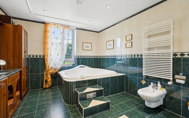 Une salle de bains avec baignoire, WC et chauffage au sol.