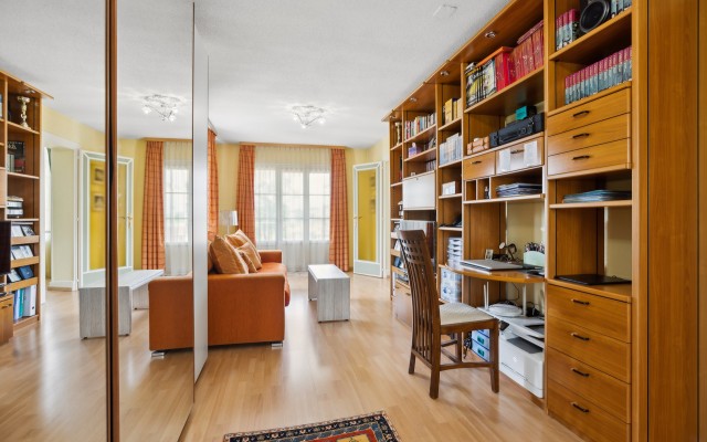 Une chambre à coucher actuellement utilisée comme bureau et salon d'appoint avec une terrasse,