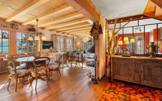 De part sa conception unique alliant, le bois, la pierre et le verre ainsi que des équipements haut de gamme, l'atmosphère y est très agréable. Grâce à ses parquets en bois massif, ses larges baies vitrées ou encore sa grande terrasse équipée d'une piscine chauffée avec jacuzzi, elle propose le meilleur des conforts. Les grands espaces sont baignés de lumière naturelle grâce aux baies vitrées, offrant des vues spectaculaires sur les montagnes environnantes depuis les différents espace de vie et les chambres.