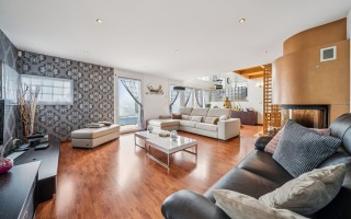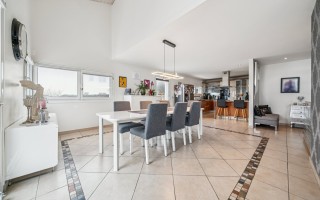 Les espaces de réception séduisent par leurs volumes généreux et leur luminosité naturelle. Le salon, agrémenté d’une cheminée, dégage une atmosphère à la fois élégante et chaleureuse, idéale pour recevoir ou se détendre dans un cadre raffiné. Les larges ouvertures créent une parfaite continuité entre intérieur et extérieur.